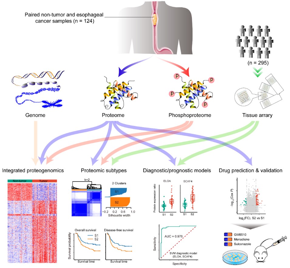 近日,药学院刘文教授课题组和汕头大学医学院李恩民教授、许丽艳研究员课题组在Nature Communications合作发表研究论文。该研究从多维组学层面全面揭示了食管癌中失调蛋白、磷酸化修饰位点及相关信号通路,发现了食管癌中具有显著生存差异的两个蛋白质组亚型,预测了针对高风险亚型的药物,并验证了药物的有效性,为指导食管癌患者的治疗决策和药物开发提供了新的思路。
