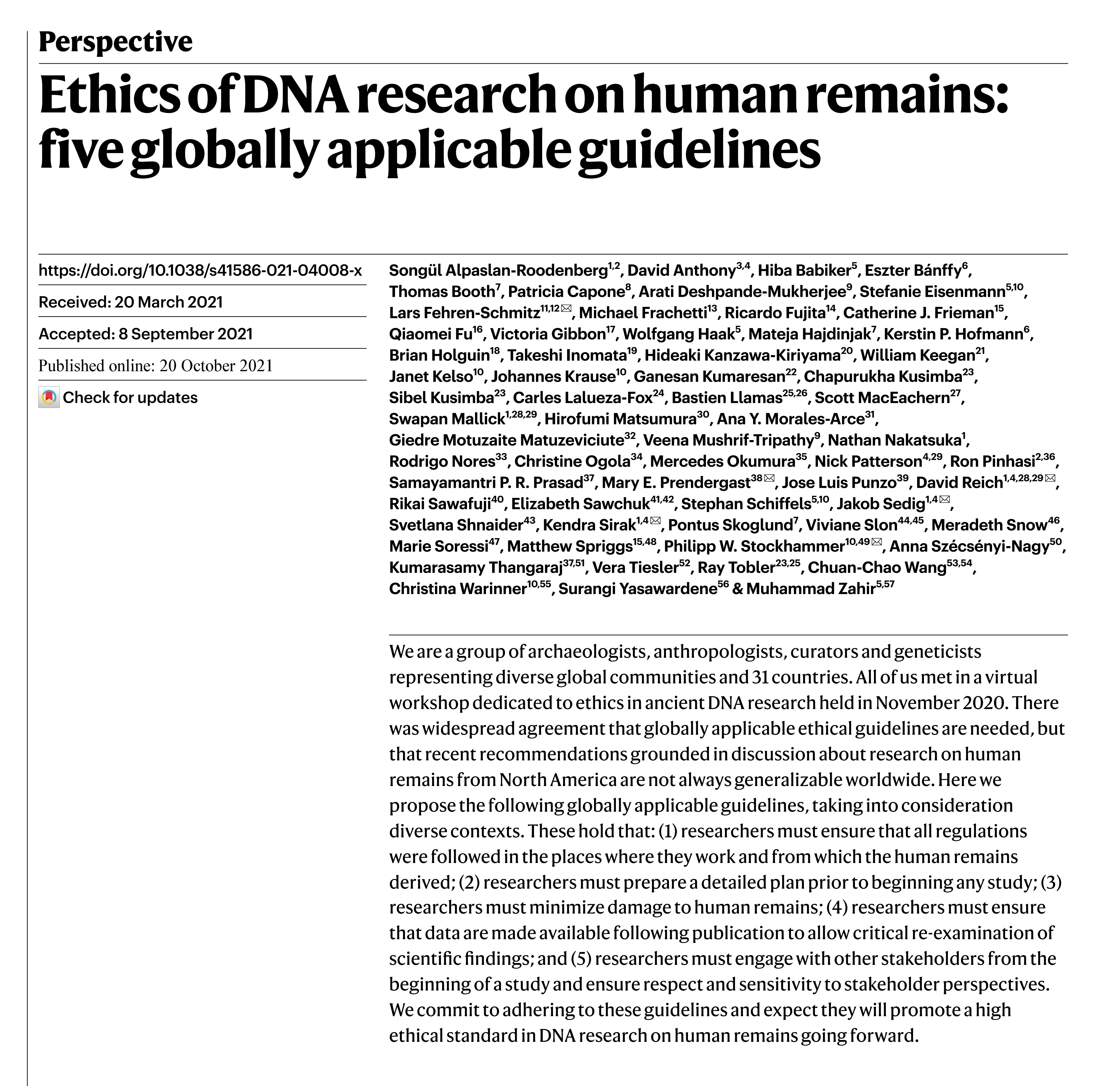 随着已发表的古代人类的全基因组数据在迅速增加—从2009年无一例到现今已超过5000个个体,相应的,关于古DNA研究伦理的讨论也相继开展。古DNA领域的迅猛发展,祖源研究的社会政治影响,以及尊重逝者的必要性,都使得制定古DNA研究伦理规范极具紧迫性。但前期基于北美洲的研究案例所提出的建议规则却难以在世界范围内被推广应用。研究人员在考虑了全球不同国家和地区多样化的情况后,研究人员提出了以下五条全球适用的准则: