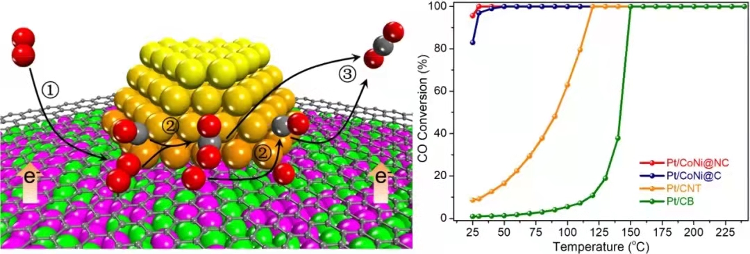 该催化剂在室温下可实现近100%的CO转化率,其性能远高于Pt/C和Pt/CoNiOx催化剂的性能。实验和理论计算表明,O2可以在Pt-石墨烯封装CoNi纳米颗粒的界面处吸附活化,而CO在Pt纳米颗粒上吸附,不与O2吸附产生竞争,从而有效促进了氧气的活化和后续的CO氧化。该工作是“铠甲催化”概念的成功拓展,为室温、高效的新型催化氧化催化剂的设计提供了新思路。