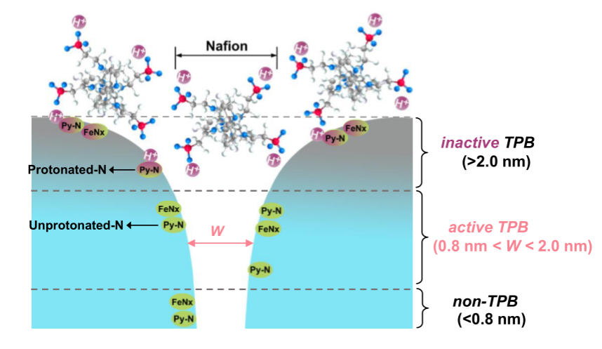 基于此,研究团队发展了一种尺寸敏感的分子探针方法,可用于在燃料电池反应条件下三相界面在微/介孔范围内的信息识别。由于Fe/N/C催化剂存在碱性的吡啶氮位点,其与酸性的聚合物电解质(Nafion)存在强烈的作用特性,据此可对三相界面进行再次区分,分为“活性三相界面”与“非活性三相界面”。对于Fe/N/C催化层,0.8-2.0 nm的微孔被认为是“活性三相界面”,贡献了至少70%的活性(即便催化剂的微孔比例仅为29%)。该研究给出了非贵金属催化剂“短微孔”的工况设计原则,减小微孔的深度,缓解传质问题,同时消除催化剂/Nafion的界面(毒化)作用,为非铂氧还原催化剂和燃料电池催化层的设计和构建提供了思路。