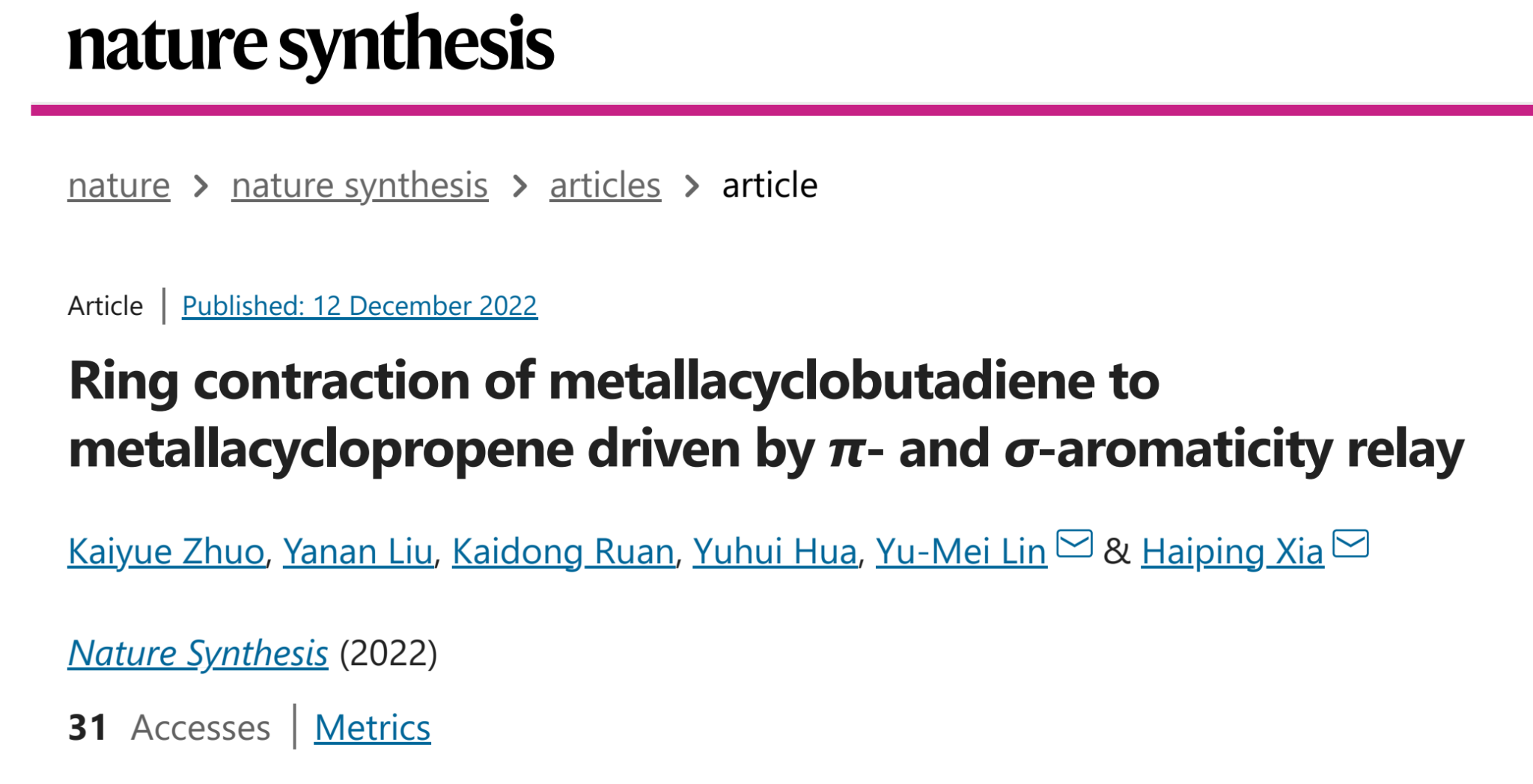 近日,化学化工学院碳龙化学研究团队提出了一种基于π-和σ-芳香性接力驱动的策略,实现了首例金属杂环丁二烯到金属杂环丙烯的缩环反应。相关成果以“Ring Contraction of Metallacyclobutadiene to Metallacyclopropene Driven by π- and σ-Aromaticity Relay”为题在线发表于《自然-合成》(Nature Synthesis)。