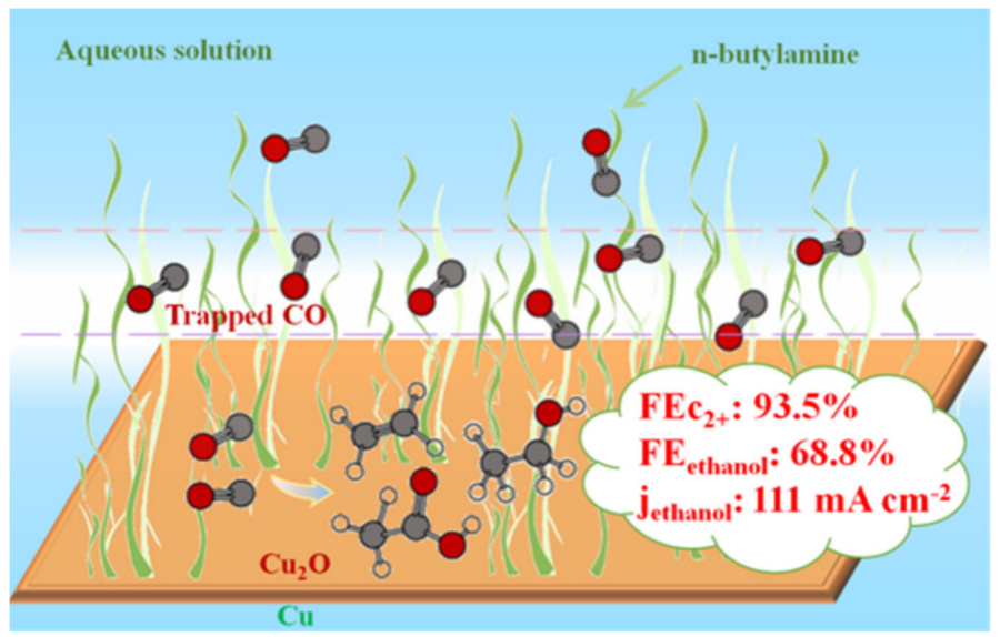 据悉,研究团队构筑了一种正丁胺修饰的Cu/Cu2O催化剂。这种催化剂可以通过正丁胺的修饰调节其表界面结构,对一氧化碳电还原生成双碳/多碳产物表现出良好的选择性,其中,生成乙醇的选择性尤为突出。