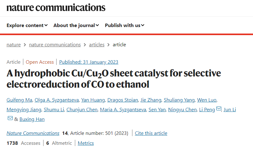 近日,厦门大学化学化工学院李军教授课题组在电催化一氧化碳还原合成乙醇方面取得重要进展,相关研究成果发表于《自然-通讯》(Nature Communications)。本工作在李军教授和彭丽副教授共同指导下完成,化学化工学院科研助理马贵峰为文章第一作者。