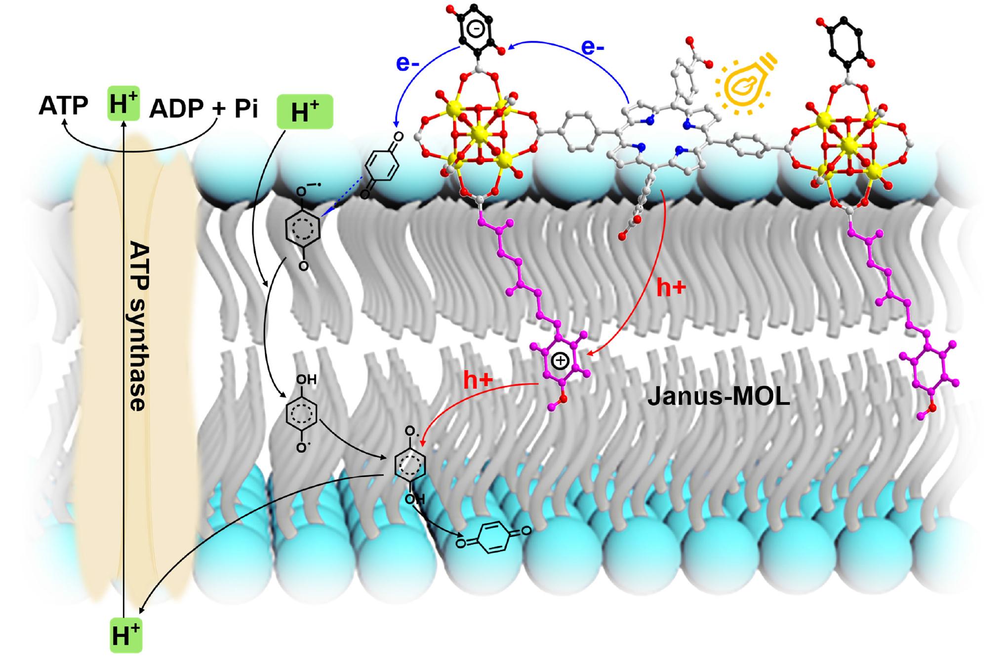 质子跨细胞膜的定向传输对生命过程至关重要。例如,在光驱动下,光合细菌可在膜内外形成质子浓度梯度,驱动ATP的合成。细胞膜的非对称性是定向质子传输的前提。金属有机单层(Metal-Organic Layers,MOLs)具有二维结构和易表面修饰的特点,能够与脂质体复合,模仿光合细菌。鉴于此,汪骋教授课题组设计合成了基于卟啉的Janus-MOLs,将其作为人造质子泵成功实现了光驱动质子主动传输。Janus-MOL通过微乳的方法制备得到,其两侧分别用羧基醌和阿维A酸(Acitretin)进行功能化,得到的Janus-MOL附着在脂质体表面形成LP-Janus-MOL。在光驱动下,Janus-MOL中的卟啉吸光,将电子和空穴分别转移到受体羧酸醌和给体阿维A酸上,随后与脂质体中自由扩散的苯醌(Q)/氢化半醌(HQ·)发生氧化还原反应,并与质子转移耦合,产生质子浓度梯度,驱动脂质体上负载的CFOF1-ATP合成酶产生ATP。因此,Janus-MOL的应用避免了方向翻转,保障了质子的单向传输。该项工作为质子跨膜的定向传输提供了一种解决方法,同时Janus-MOL这一策略为其他特定功能的非对称界面的构筑提供了新的思路。