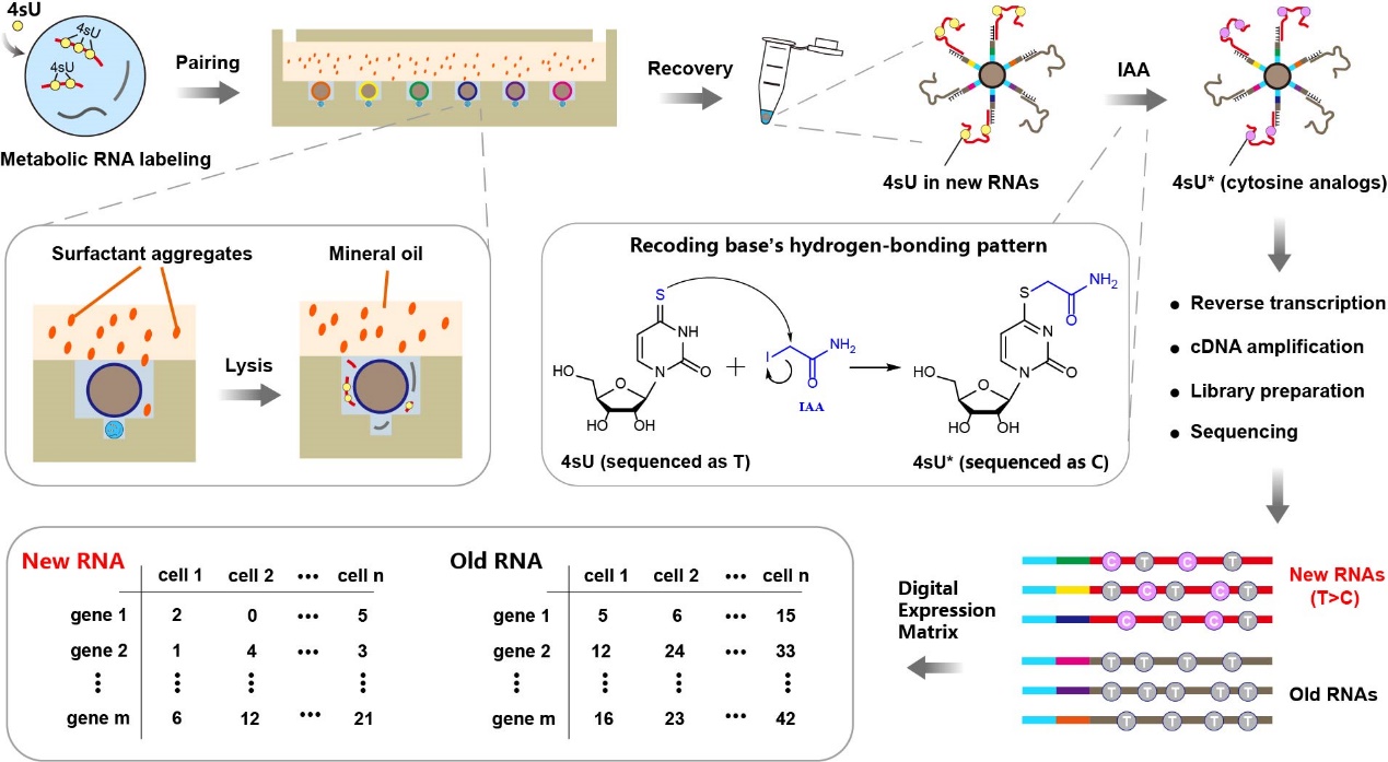 针对上述挑战,杨朝勇教授团队借助RNA代谢标记这一化学工具,开发了一种高通量、低成本、精准、高效的单细胞时间转录组测序新方法(Well-TEMP-seq)。该方法将RNA代谢标记与课题组自主研发的基于准静态流体动力学和尺寸选择原理的单细胞转录组测序平台Well-paired-seq相结合,成功实现了数千个单细胞基因表达动态过程的同时解析。Well-TEMP-seq采用核苷酸类似物(4-硫代尿苷,4sU)标记细胞,记录一段时间内细胞新转录生成的RNA。通过后续的化学转化反应(碘乙酰胺IAA取代反应),诱导4sU标记位点定向突变(U>C),再利用高通量测序和生物信息学统计分析,鉴定新生RNA并与已有RNA进行区分,从而获得每个细胞的每种基因的动态表达信息。在具体应用方面,Well-TEMP-seq成功解析了结直肠癌细胞在临床使用的DNA去甲基化药物地西他滨(5-AZA-CdR)低剂量刺激后的基因表达过程,首次揭示了地西他滨治疗初期发生的抑癌基因激活、致癌基因抑制和抗病毒免疫通路激活等关键分子生物学事件。由于Well-TEMP-seq操作简便且无需复杂仪器,有望推广至各类生物学实验室,用于解析不同生物学过程中单细胞基因表达动态信息。