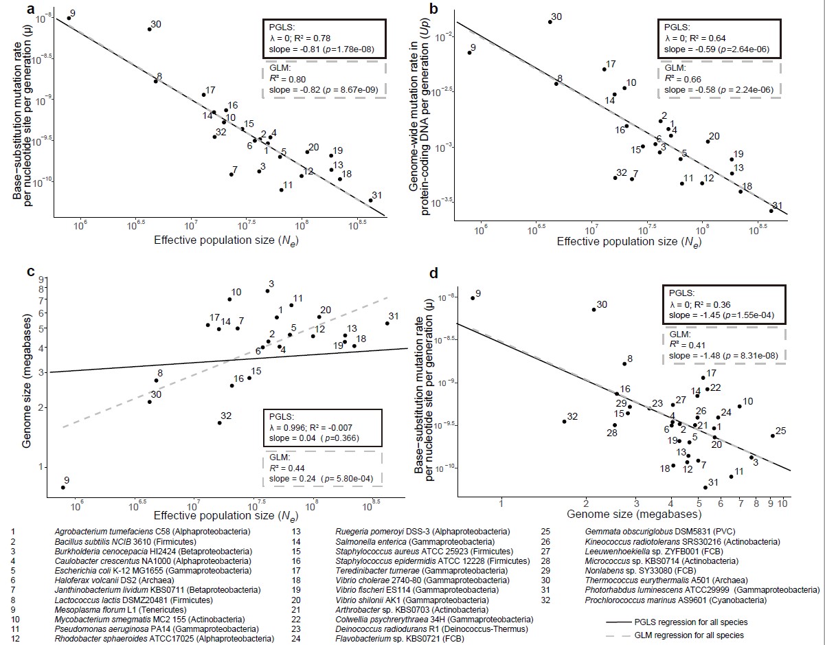 图. 原核生物基因组大小(G)、碱基替换速率(μ)、全基因组突变速率(Up)、有效种群数量(Ne)之间的相互关系。