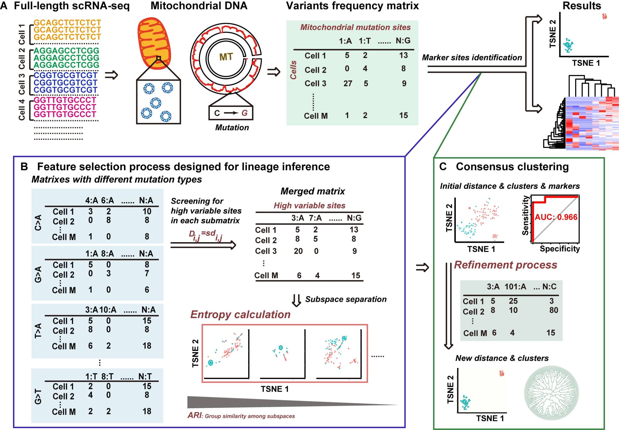 谱系示踪技术是研究细胞发育、疾病发生以及癌细胞克隆进化的重要分析方法。随着单细胞转录组测序(scRNA-seq)技术和相关计算工具的发展,scRNA-seq数据已被应用于细胞谱系信息的挖掘。传统的谱系示踪技术和基于基因编辑的谱系分析都受限于复杂的实验操作,难以应用于临床样本;以全基因组上的RNA突变为内源性条形码的谱系分析方法又对测序覆盖度有高要求;相比之下,高频、可传代的线粒体基因组RNA突变是内源性条形码的较优选择,然而已有方法需要同批样本的群体染色质可及性测序(bulk ATAC-seq)或者全基因组测序数据进行谱系信息提取,同样限制了其应用。