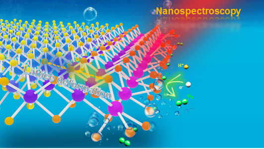 有鉴于此,任斌教授课题组于2015年在国际上首次发展出电化学针尖增强拉曼光谱技术(EC-TERS,J. Am. Chem. Soc., 2015, 137, 11928)。该技术能同时获得电化学界面纳米尺度的形貌信息和表面物种的拉曼光谱。在此基础上发展出基于AFM的EC-TERS技术,解决了针尖的稳定性和灵敏度问题(Anal. Chem., 2020, 92, 12548)。基于自主发展的仪器方法,在电催化析氢过程中首次实现二维MoS2活性位点的晶格结构和电子性质的动态表征。研究发现,MoS2的活性位(即边缘位)的本征结构性质在电化学活化和析氢阶段分别经历不可逆和可逆演变,而非活性位(即基面)则无变化。特别地,通过原位纳米级高空间分辨EC-TERS成像使活性位周围材料的协同重构区域可视化。具体如下:(1)在未参与催化反应之前,处于初始状态的边缘位具有最低电子密度,其特殊的结构性质引起周围材料2 nm的晶格重构,和10 nm的电子密度重构区域。(2)在电化学活化处理时,氢吸附引入的拉伸应力使边缘位的晶格形变不断增大,进而电子密度持续增高,这些不可逆变化引起21 nm的晶格重构和25 nm的电子密度重构。(3)在析氢阶段,大量氢吸附会进一步加剧边缘位的晶格形变,同时抬升其费米能级进而导致电子从边缘位流向基面,而晶格重构和电子密度重构范围则进一步扩大到~40 nm。结合DFT理论计算进一步揭示了重构区域虽然并不直接参与析氢反应,但该协同重构可有效降低反应势垒,实现高效的催化反应。该研究成果首次以纳米分辨在实空间揭示了电催化析氢过程中二维材料活性位完整的形成过程及其随反应过程的演变,为原位动态观测活性位的演化提供了新的表征方法,丰富了对活性位的理解,对理性设计高效电催化剂提供指导。