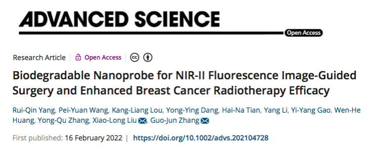 近日,厦门大学附属翔安医院执行院长、医学院张国君教授团队及中科院福建物质结构研究所刘小龙教授团队在国际知名综合性期刊《Advanced Science》上联合发表论文“Biodegradable Nanoprobe for NIR-II Fluorescence Image-Guided Surgery and Enhanced Breast Cancer Radiotherapy Efficacy”,阐述了一种基于生物体内可降解纳米探针、可用于乳腺癌手术导航和放疗增敏的多功能诊疗平台。厦门大学医学院博士研究生杨瑞钦及中国科学院福建物质结构研究所王培园副研究员为本文共同第一作者,张国君教授及刘小龙教授为本文通讯作者。相关工作得到了国家自然科学基金、福建省科技重大专项专题等5项基金的资助。
