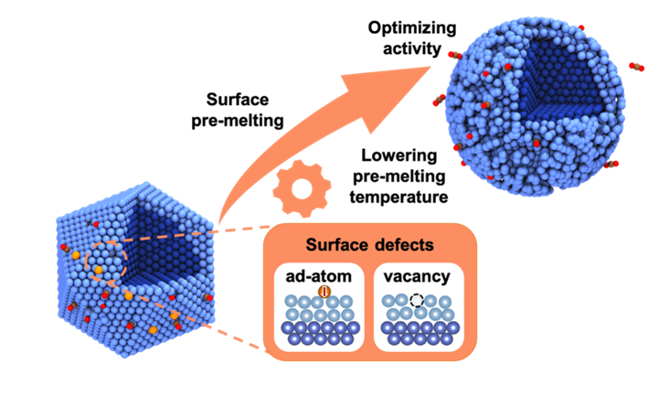 本工作结合增强采样算法与主动学习策略构造机器学习势函数训练与自由能计算自动化工作流,以高度对称的Cu55纳米团簇催化CO2解离过程作为模型反应,研究催化剂表面结构的动态变化与催化反应之间的耦合关系。通过严格计算自由能的温度依赖性,揭示了催化剂表面预熔对反应引入异常熵贡献,从而调控催化活性的新机制。并进一步研究了具有表面点缺陷的纳米催化剂,即空位(vacancy)和吸附原子(adatom),观察到纳米团簇表面熔化温度的显著降低,使反应在更温和的条件下更有利。