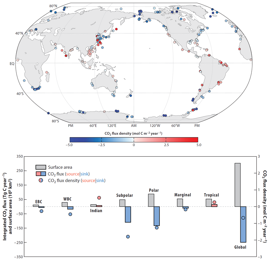 图1. 全球近海单位面积海-气CO2通量新集成(上图);