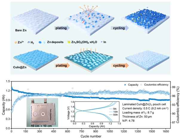 近日,我校化学化工学院赵金保教授/杨阳副教授团队在锌金属电池负极界面设计的研究中取得新进展,相关成果以“Synergetic Bifunctional Cu-In Alloy Interface Enables Ah-Level Zn Metal Pouch Cells”为题发表在Nature communications期刊(DOI: 10.1038/s41467-024-53831-z)。