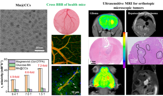 针对临床磁共振造影剂减毒增效的临床需求,本研究以食品添加剂锰葡萄糖酸盐和氨基酸为前体,开发出了锰碳化顺磁性配合物(Mn@CCs)。性能表征结果发现,与临床最广泛使用的马根维显(Gd-DTPA)相比,Mn2+密封在碳化壳中实现了超高的Mn2+稳定性和r1弛豫率(22.1 mM−1s−1, 9.4 T),且同时具备优良的光学性能。本研究首先以正常健康小鼠为研究对象,分别注射同量的Mn@CCs和临床造影剂Gd-DTPA,脑部磁共振成像结果显示,Mn@CCs 能够有效穿过完整的血脑屏障,实现了脑实质磁共振信号增强,而Gd-DTPA脑实质信号几乎无变化。多光子成像结果和脑组织切片结果进一步证实Mn@CCs能够有效穿过完整的血脑屏障。其次,利用成功构建的原位脑瘤和原位肝癌模型鼠作为研究对象:成像结果显示,与Gd-DTPA相比,三维(3D)磁共振重建成像和光片荧光显微镜(LSFM)成像清晰的呈现出Mn@CCs高效靶向不同阶段的胶质瘤组织;同时,Mn@CCs具有高穿透性,能够实现肿瘤内均匀分布,精确诊断脑肿瘤边缘和微小单结节脑肿瘤(约1毫米)。进一步,在原位肝癌小鼠模型中,能够有效地检测并区分多结节肝肿瘤(每个结节<1毫米)。更重要的是,Mn@CCs在尾静脉注射后 4小时通过肾脏清除有效地从机体排出,减少机体的沉积。