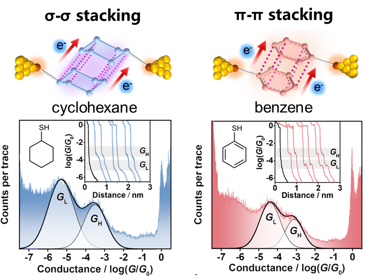分子间的相互作用,是化学、材料、物理、生物、医学乃至电子学等多学科研究中的一个重要而基本的科学问题。对于相互靠近的两个共轭分子,已经有很多的实验证据证明,苯环之间能够通过π电子云之间的相互作用发生分子间的堆积作用进而发生电子的输运,即π-π堆积作用;对π-π堆积作用的深入研究和认识已经成为了科研工作者研究和认识DNA组装、多肽折叠等生命过程、以及设计和制备有机电子学和柔性电子学材料的重要基础。然而,对于缺少π电子的非共轭分子体系,两个分子间是否也能够通过分子骨架上的σ电子发生相互作用,则长期缺乏直接的实验证据,其主要挑战在于难以将两个分子精确控制在分子间相互作用的作用距离内,并以此实现基于该相互作用电子输运的精确测量。