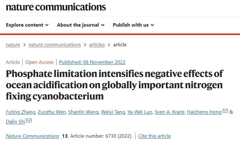 Zhang F.#,Wen Z.#, Wang S., Tang W., Luo Y.-W., Kranz S.A.,Hong H.*,Shi D.*(2022) Phosphate limitation intensifies negative effects of ocean acidification on globally important nitrogen fixing cyanobacterium.Nature Communications13: 6730