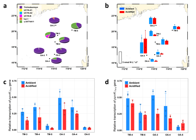 工业革命以来,海洋吸收了约三分之一人为排放的CO2,以迄今3亿年来最快的速度酸化(CO2升高、pH下降),这势必影响海洋生态系统的关键过程和功能。全球海洋面积一半以上海区的初级生产力受氮营养盐缺乏的限制,而优势固氮蓝藻束毛藻是寡营养海区中氮的重要来源,可贡献高达50%的海洋总固氮量,从而显著影响海洋初级生产力和气候调节功能。因此,海洋酸化对束毛藻的影响及其效应备受学界关注。