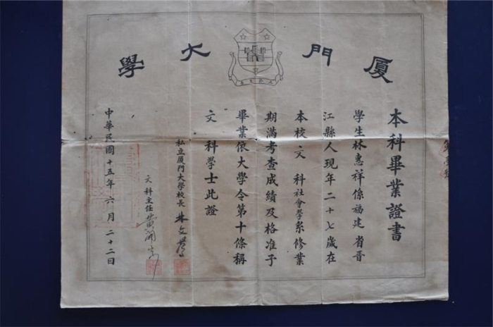 林惠祥是学校第一届文科生第一号毕业证书持有人
