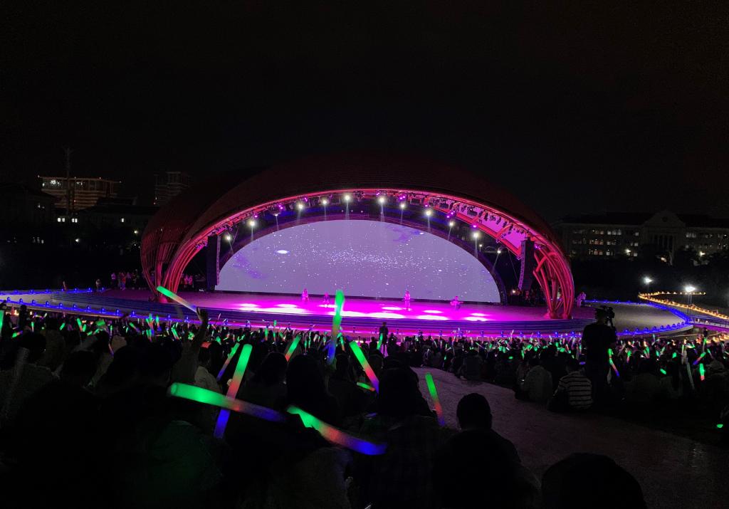 伴着全新的舞台、绚丽的灯光,翔安校区“小巨蛋”正式亮相。未到开场时间,现场便已成了一片“荧光海”。师生结伴前来,在草坪上席地而坐。在校区学生乐队的暖场乐曲中,“草坪迎新晚会”拉开帷幕。