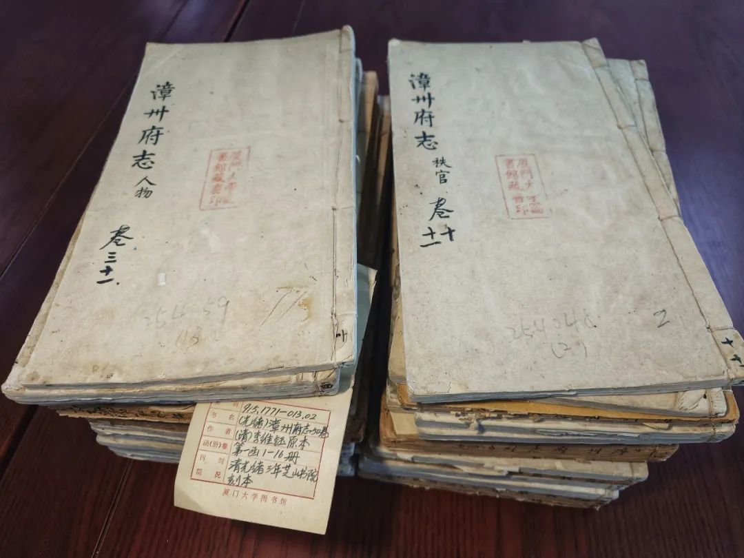 ▲厦门大学图书馆馆藏光绪《漳州府志》书影。光绪《漳州府志》五十卷首一卷,三十二册,清光绪三年(1877年)芝山书院刻本。薛澄清转赠本是残本,当时仅存十九册,可见此书之难得。新中国成立后,图书馆再次搜求,现为补配后的全本。