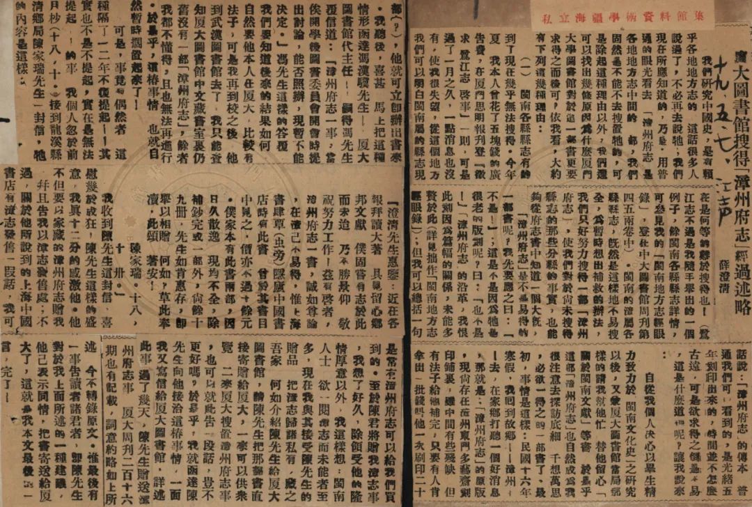 ▲《江声报》登载薛澄清《厦大图书馆搜得〈漳州府志〉经过述略》