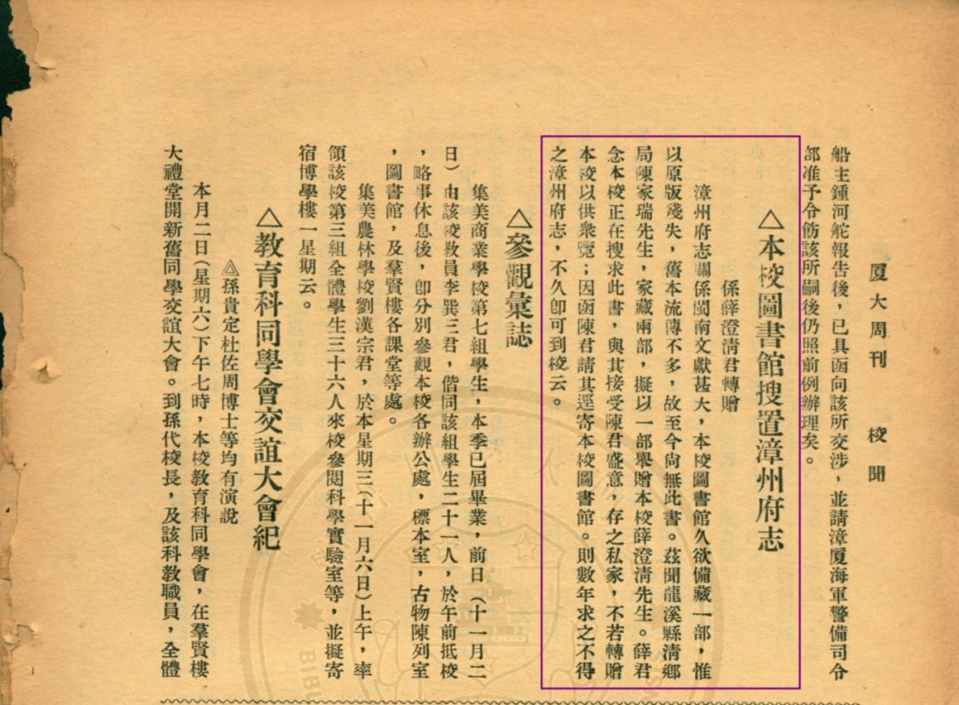 ▲《厦大周刊》登载《本校图书馆搜置漳州府志》
