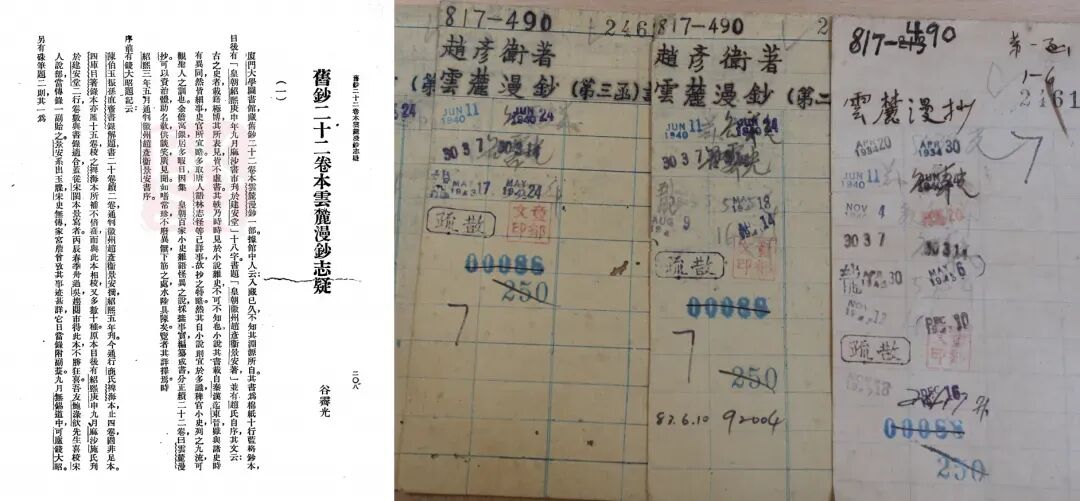 ▲左:《图书季刊》载1941年12月《旧钞二十二卷本云麓漫钞志疑》;右:《云麓漫钞》书袋卡