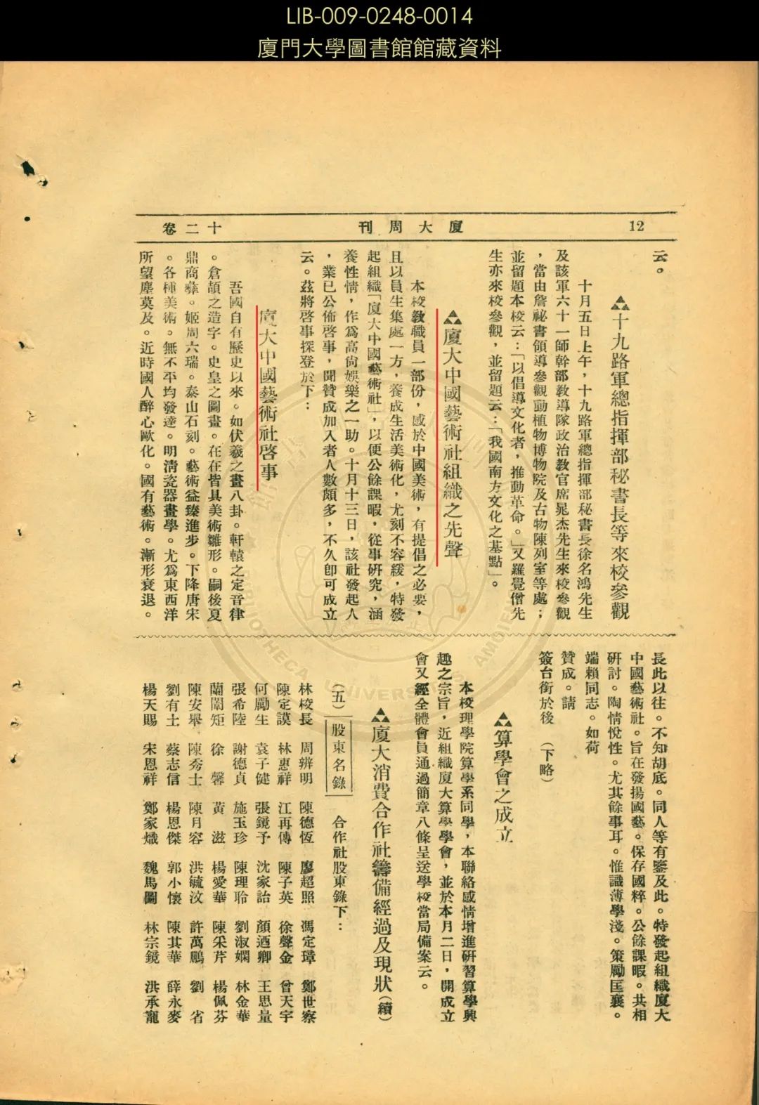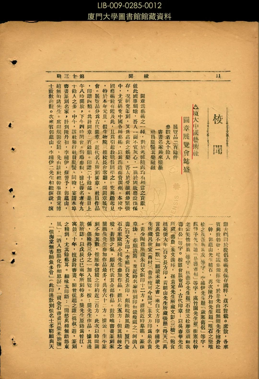 2018年,习近平总书记在全国教育大会上强调,“要全面加强和改进学校美育,配齐配好美育教师,坚持以美育人、以文化人,提高学生审美和人文素养。”美育是促进学生全面卓越发展必不可少的组成部分。在厦大百年校史上,美育工作具有优良传统,其实施办法值得传承。“书香文脉”第13期向读者推介校史上的一段美育记忆——1934年厦大中国艺术社图章展览会遗存。