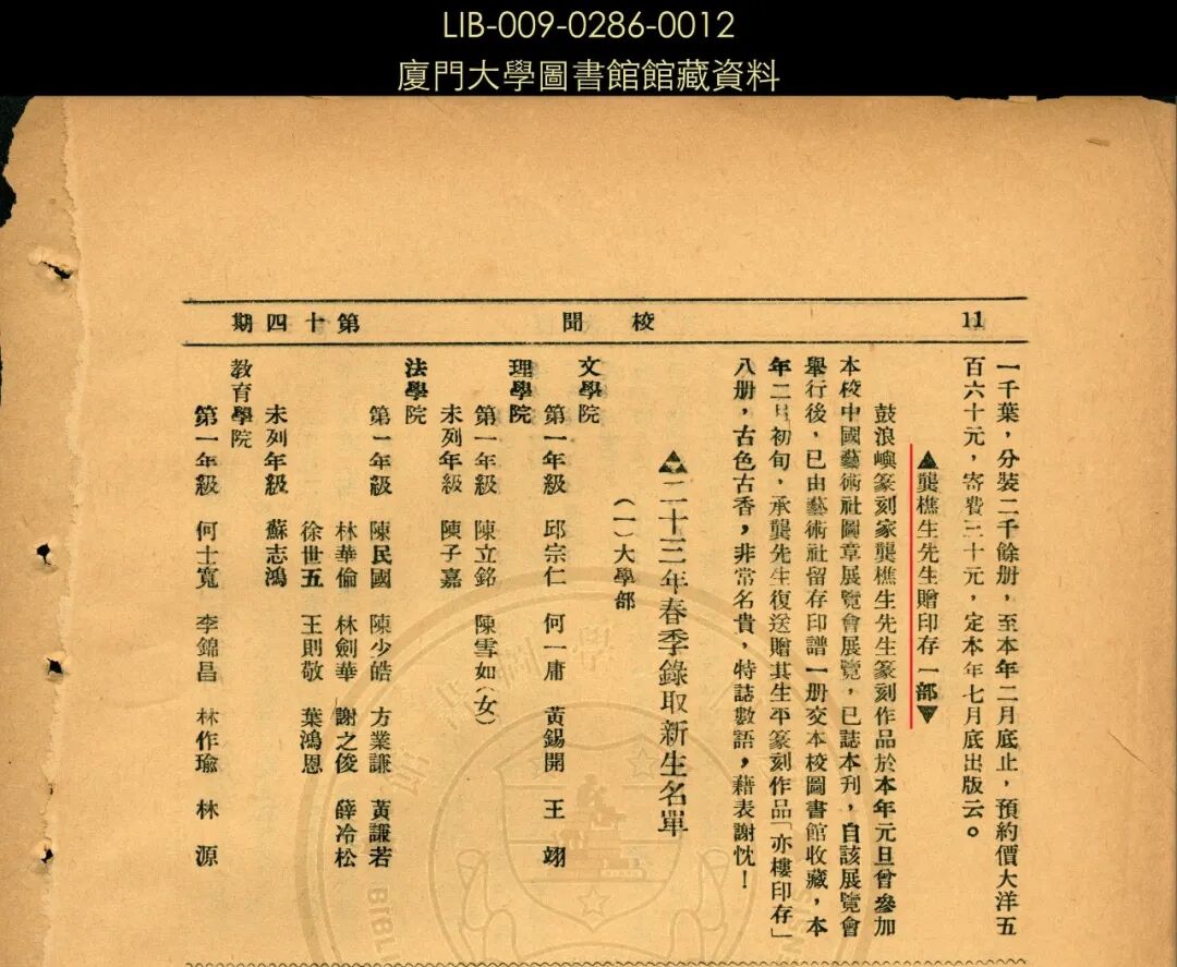 ▲《厦大周刊》1934年第332期刊登《龚樵生先生赠印存一部》