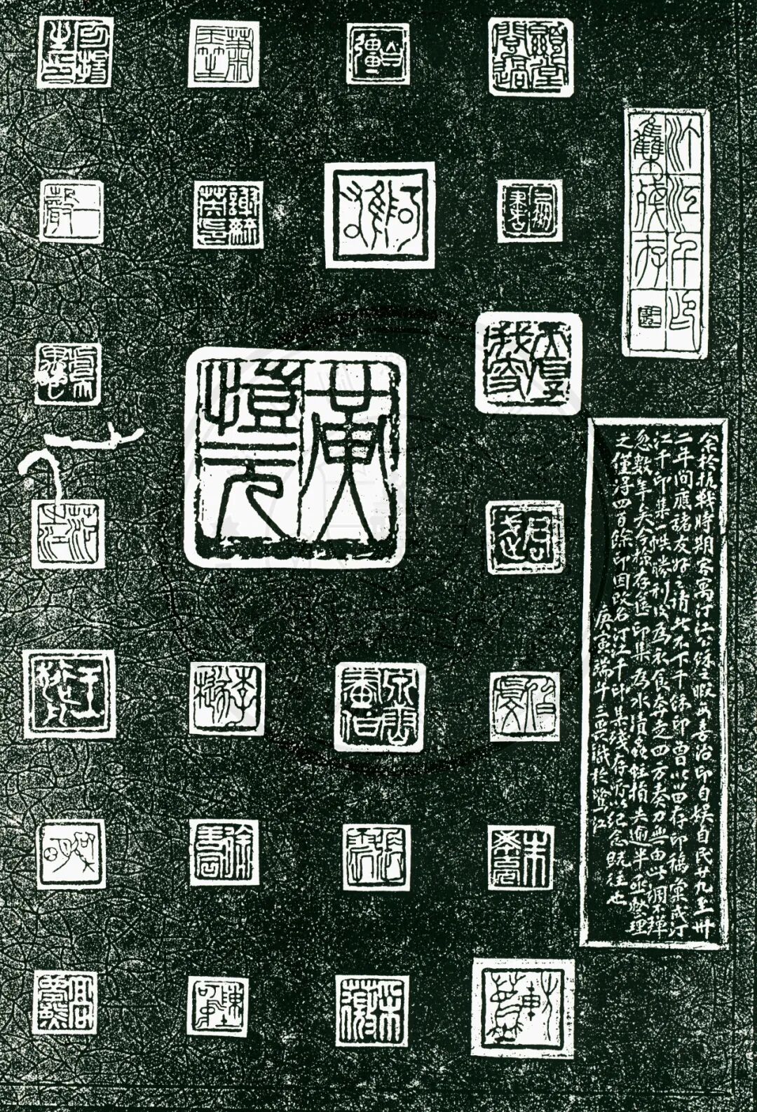 ▲《了斋书法篆刻存稿》“汀江千印集残存”。 右侧边款释文:“余于抗战时期客寓汀江,公余之暇每喜治印自娱。自民廿九年至卅二年间,应诸友好之请者不下千余印,曾以留存印稿汇成《汀江千印集》一帙。胜利后为衣食奔走四方,奏刀无由,此调不弹,忽数年矣。今检存箧印集为水渍虫蛀,损失逾半,亟整理之,仅得四百余印,因改名《汀江千印集残存》,所以纪念既往也。 庚寅端午 三畏识于鹭江”