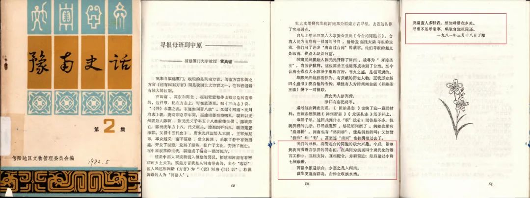 ▲黄典诚:《寻根母语到中原》。刊载于信阳地区文物管理委员会编《豫南史话》,1982年。