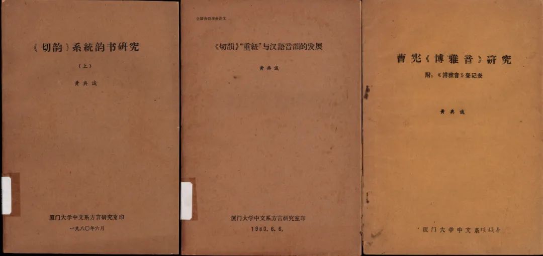 ▲左:《〈切韵〉系统韵书研究》(上中下三册),厦门大学中文系方言研究室1980年油印本;中:《〈切韵〉“重纽”与汉语音韵的发展》一册,厦门大学中文系方言研究室1980年油印本;右:《曹宪〈博雅音〉研究附:〈博雅音〉登记表》二册,厦门大学中文系油印本。
