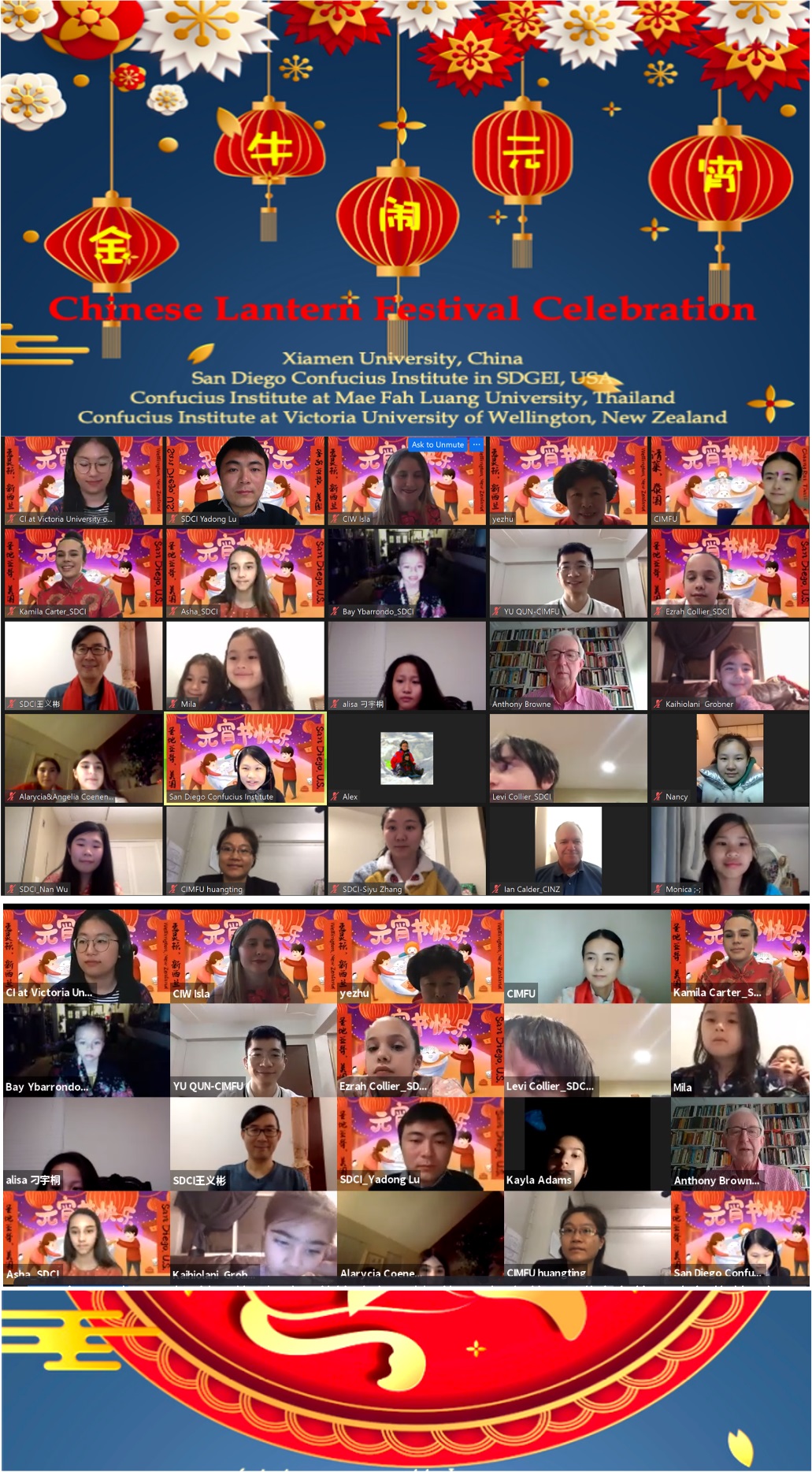 惠灵顿时间2月28日下,由中国厦门大学合作共建的三所孔子学院的学员通过网络在一起欢度了中国新春佳节——元宵节。这三所孔子学院分别是新西兰惠灵顿维多利亚大学孔子学院、美国圣地亚哥孔子学院和泰国皇太后大学孔子学院。在联欢会上同学们通过Zoom 网络,展演了中国戏曲、歌舞、器乐等精彩表演,演绎了学子们对中国语言文化及艺术的热爱,也展示了他们的青春活泼及多才多艺。