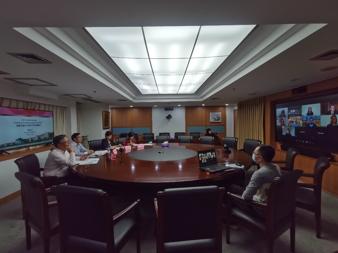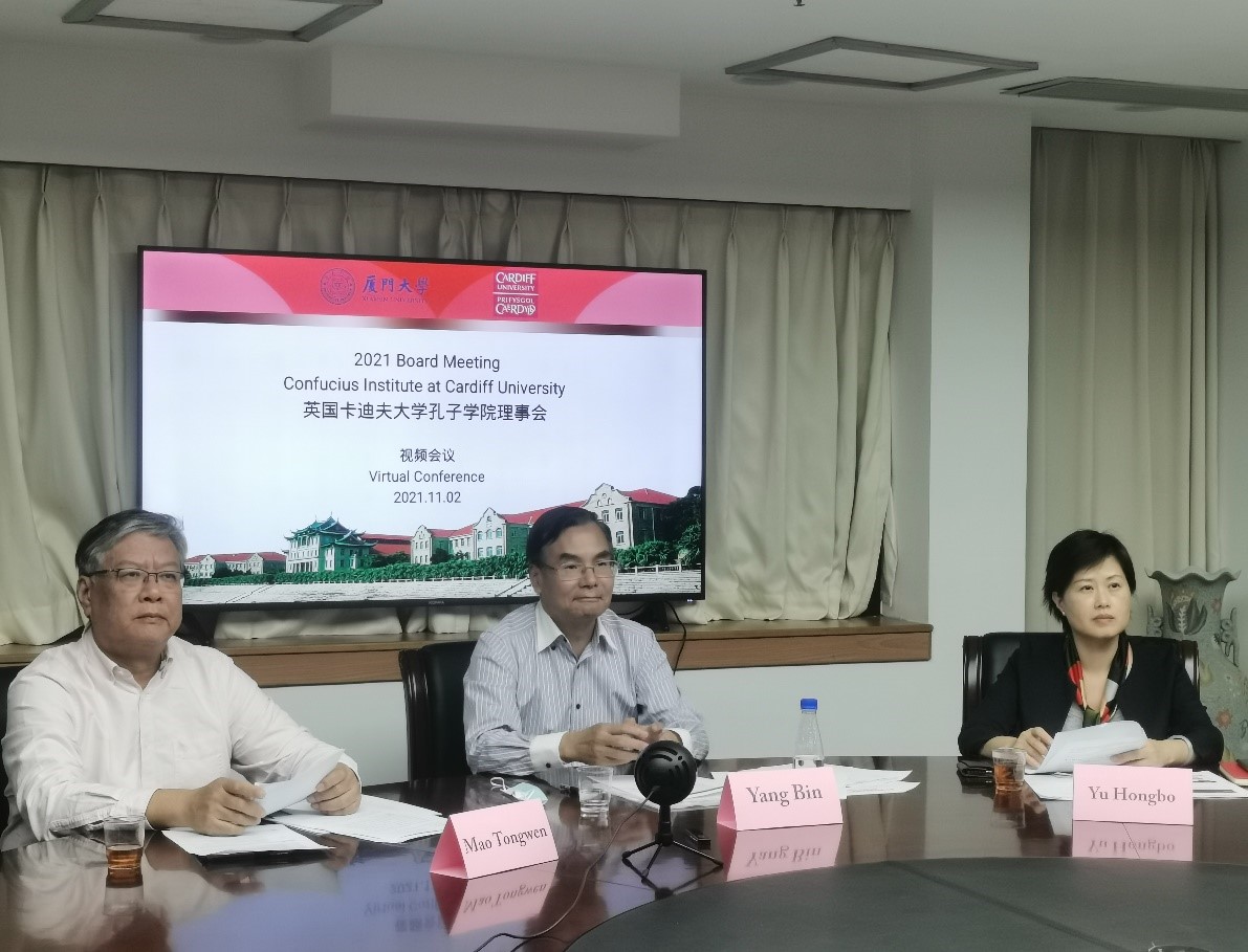 北京时间11月2日下午,英国卡迪夫大学孔子学院2021年视频理事会成功召开。我校副校长杨斌、国际关系学院院务委员会主任、国际中文教育学院/海外教育学院副院长毛通文、海外办学办执行主任、国际合作与交流处副处长余宏波、孔子学院中方院长林丽芳等出席此次理事会。卡迪夫大学副校长鲁道夫·阿里曼(Rudolf Alleman)、国际事务院长、中国医学合作中心主任姜文国、欧洲及国际部事务经理埃维·劳卡宁(Eevi Laukkanen)、现代语言学院院长大卫·克拉克(David Clarke)、孔子学院外方院长柯思宁(Catherine Chabert)、孔子学院项目总经理克莉丝汀·考克斯(Christine Cox)作为英方代表一同参会。双方就孔子学院转隶后两校如何加强孔子学院建设以及如何通过孔子学院平台加强两校交流合作等问题展开讨论。