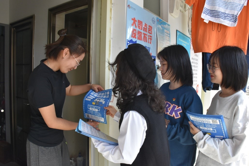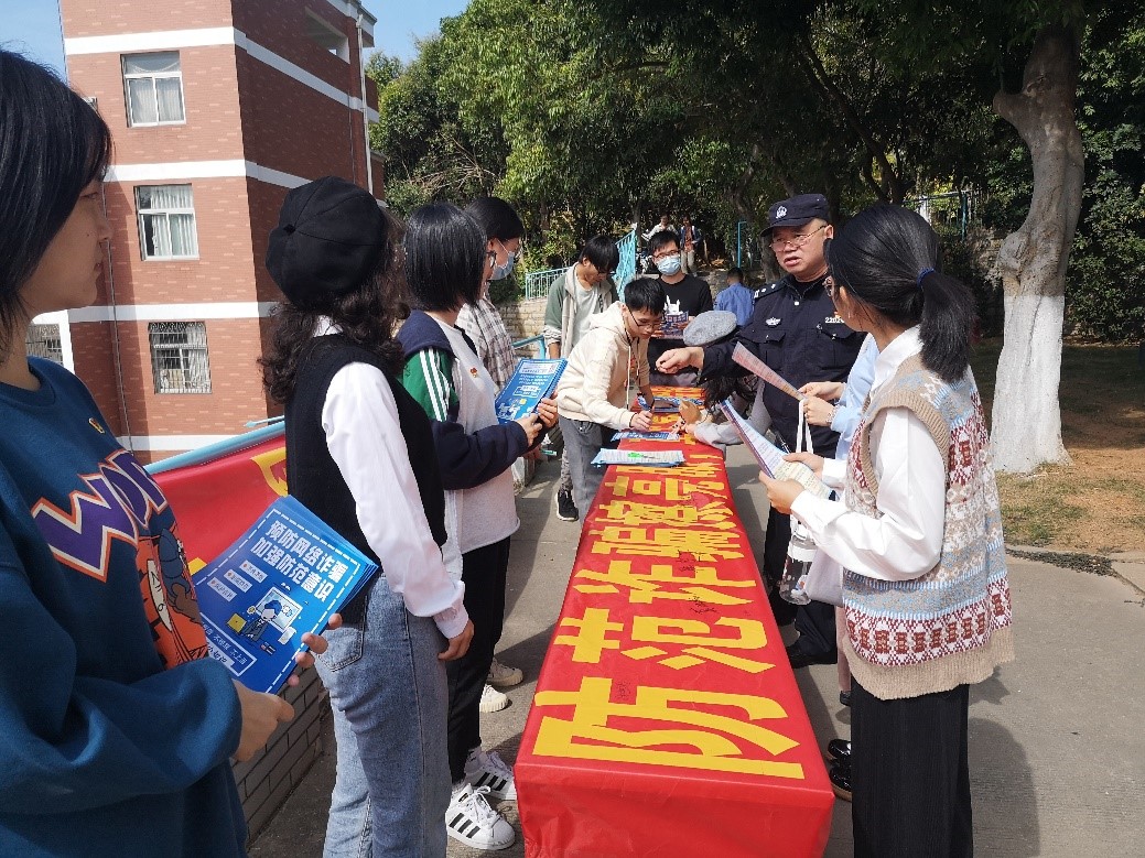 为了增强学生防骗意识,保障学生财产安全不受侵害,11月10日,公共事务学院本科生党支部依托“支部建在宿舍”项目,联合大学路派出所在宿舍区开展了防诈骗宣传活动。芙蓉十三片区民警、大学路派出所警官杨福全及学院学工组老师到场指导,公共事务学院本科生党员参加活动。