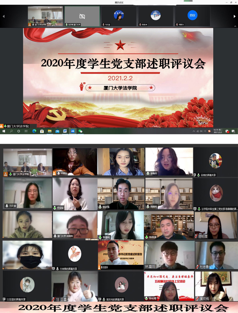 2020年,在学校、学院党委的坚强领导下,法学院各学生党支部带领全体学生党员以学促行、以行促知,不断巩固深化“不忘初心,牢记使命”主题教育成果,大力弘扬伟大抗疫精神,持续推进学习贯彻习近平新时代中国特色社会主义思想往深里走、往心里走、往实里走。2021年是中国共产党成立100周年、厦门大学建立100周年,也是实施“十四五”规划、开启全面建设社会主义现代化国家新征程的第一年,各学生党支部要把握新发展阶段,贯彻新发展理念,融入新发展格局,着力提升所在支部的党建领导力、思想引领力、堡垒组织力和战斗执行力,助力学校、学院“十四五”规划开好局、起好步,以优异成绩喜迎建党、建校100周年。