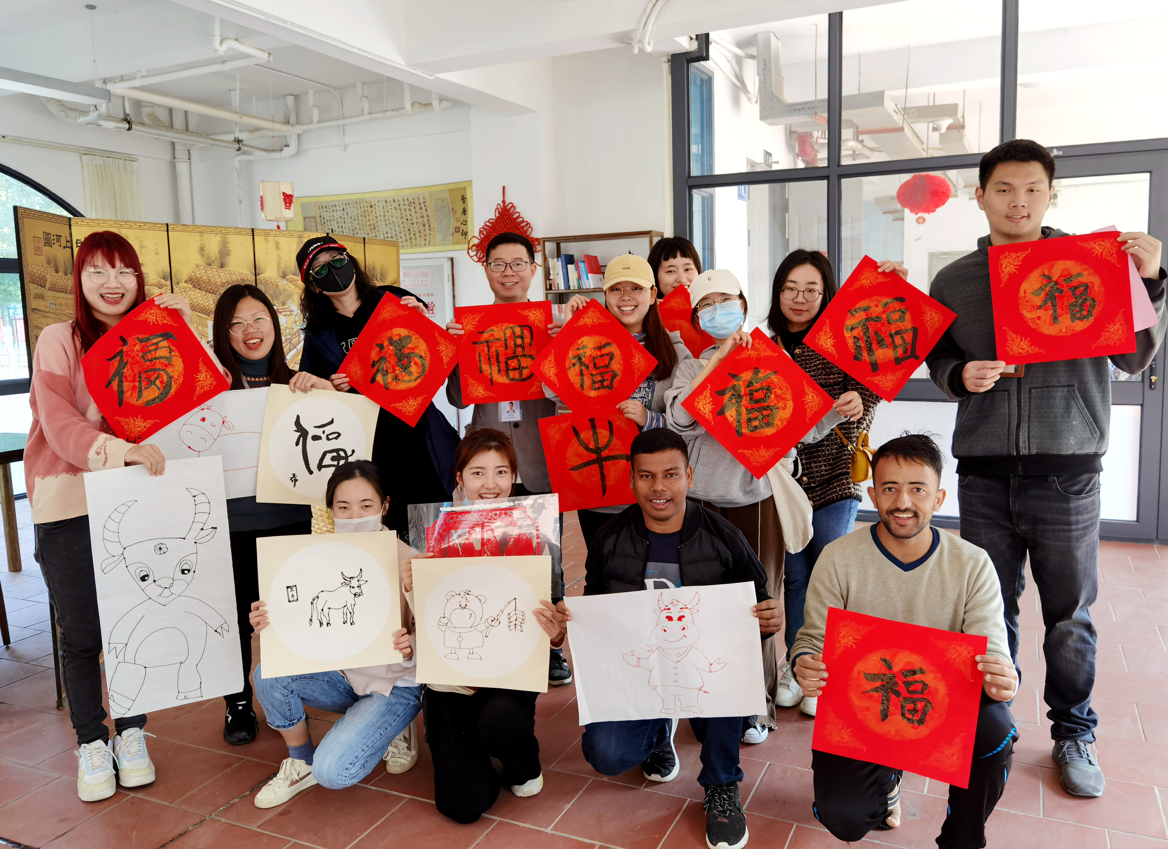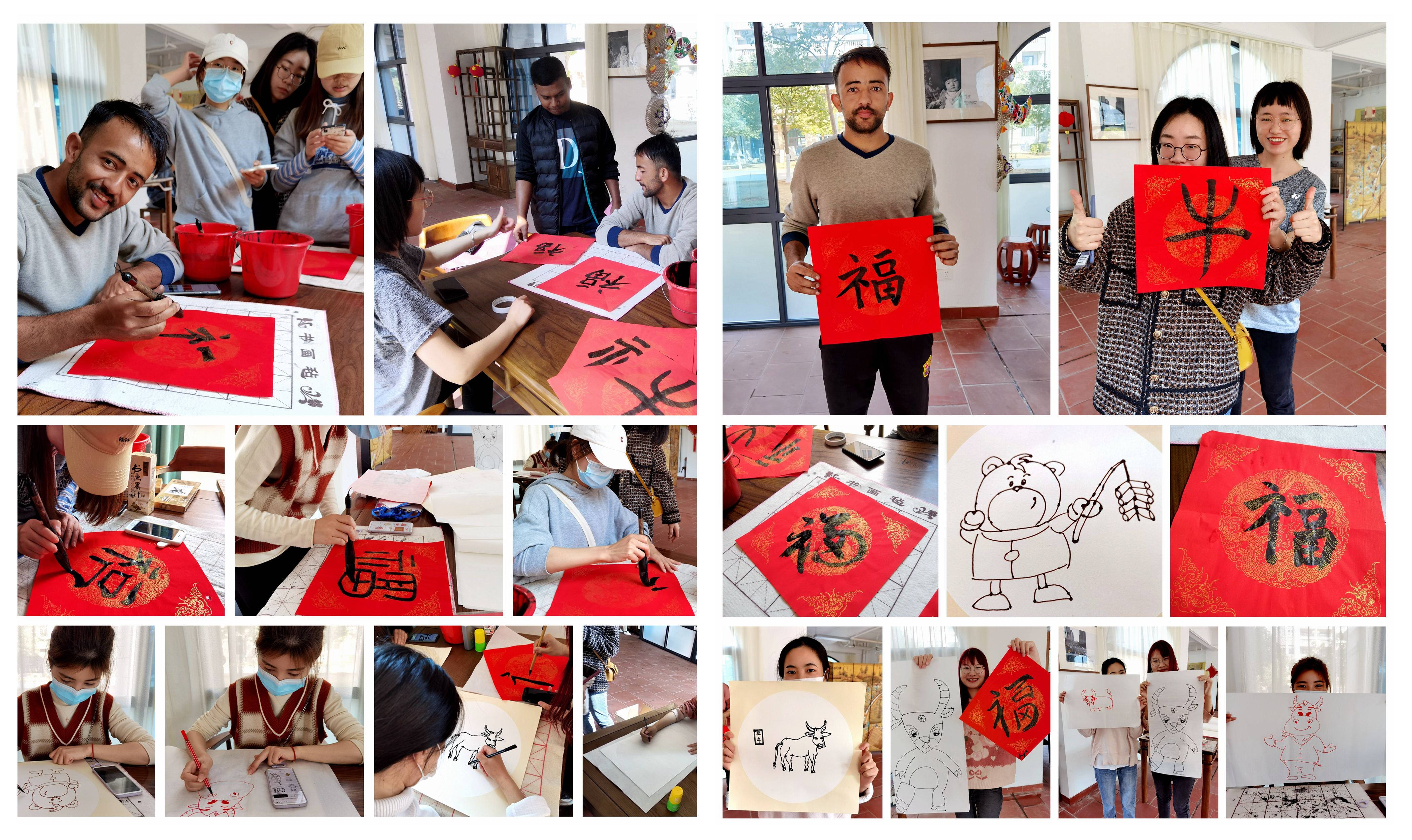 福字代表着对新年的美好祝福,牛则是今年新年的象征。为了让留校学生尤其是国际学生更好地体验中国节日文化,感受浓厚的新年氛围,同学们在除尘布新之后便开始了“写福字、绘丑牛”活动。同学们洋溢着饱满的创作热情,争相挥毫泼墨,各展其才,一笔一画间,每个人都创作出了各具特色的作品,送上2021年新春最美好的祝福。最后,迎新春活动在同学们的欢声笑语中圆满结束。