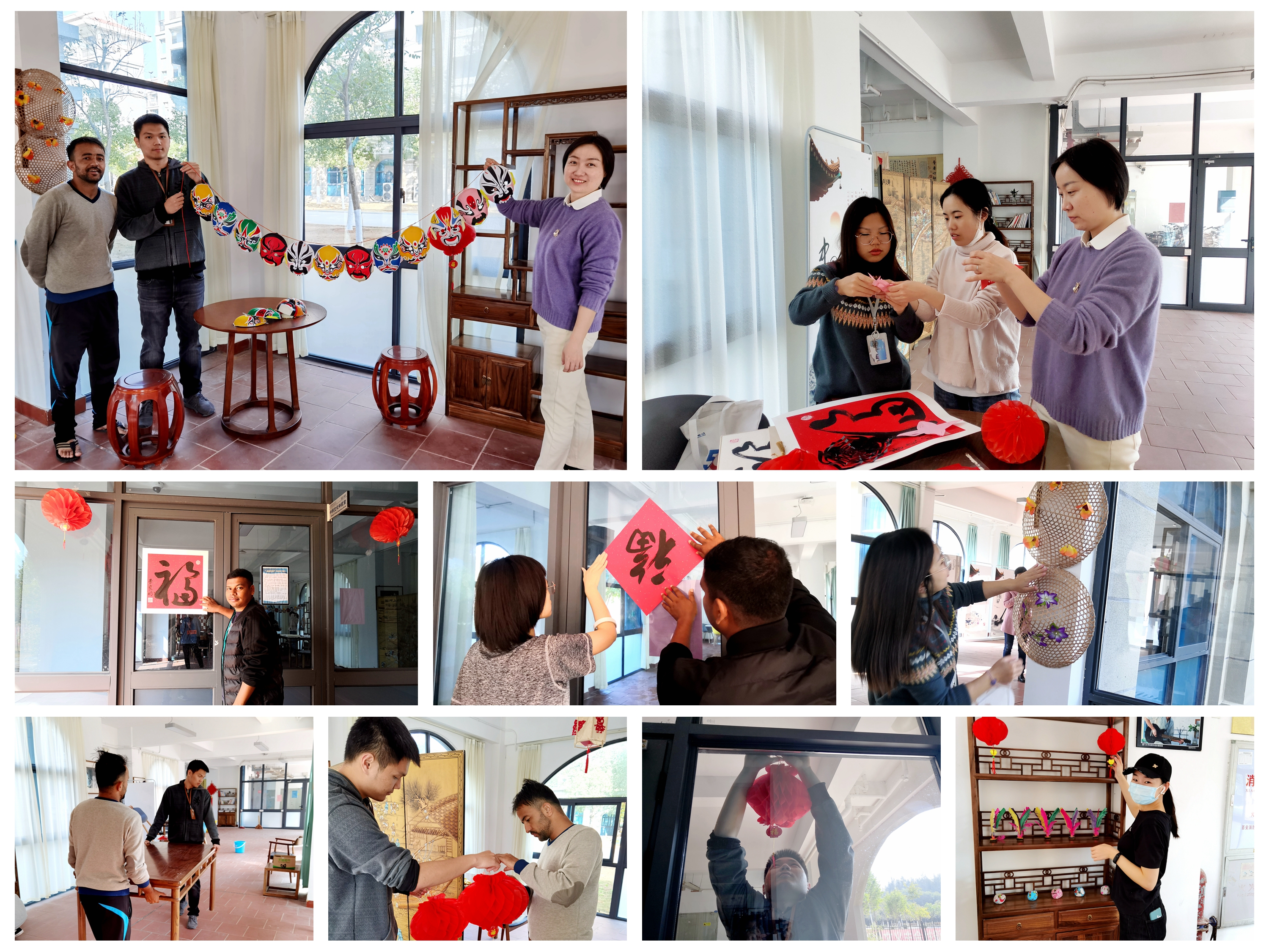 中华文化体验室是中外学生日常体验中华文化的重要场地,装饰了很多中国的文化元素,如古朴的书架和桌椅、屏风、脸谱、书画、毽子等等。为了让它更具有年味,大家一起系中国结、贴福字、挂灯笼,其乐融融。不一会儿,中华文化体验室就被星星点点的中国红点亮了,焕然一新。