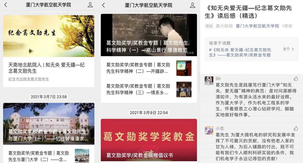 在百年校庆即将来临之际,为弘扬院友优秀事迹和精神品格、为学院事业发展注入强大动能,航空航天学院掀起了学习宣传机电工程系1942级杰出系友葛文勋事迹的热潮。学院在微信平台推出葛文勋事迹连载和系列专题,组织各师生党支部以“双周政治理论学习”“固定党日+”活动等形式,号召团组织以微团课、主题沙龙等形式,广泛学习葛文勋一生爱国爱校、献身科学教育的精神以及“知无央,爱无疆”的情怀。