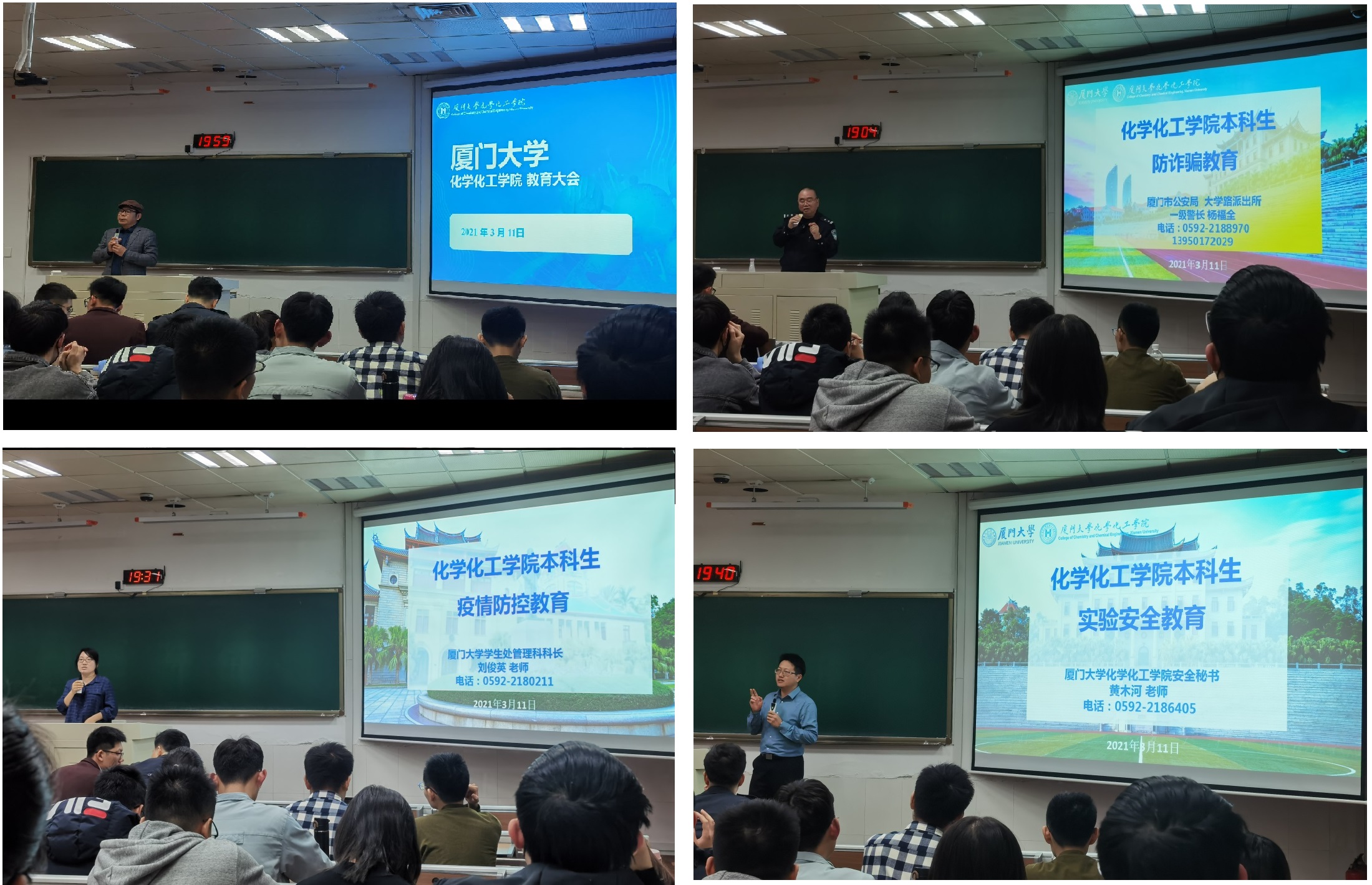 3月11日晚7:00,新学期化学化工学院“安全教育第一课”在思明校区集美二104开讲。厦门市公安局大学路派出所一级警长杨福全、学生处管理科科长刘俊英及化学化工学院安全秘书黄木河为学院全体本科生学生骨干进行一场生动的安全教育课。