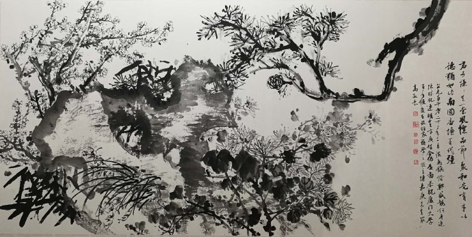 画作先由方广智老师在画幅的左中位置,以灵动的墨笔勾勒出嵯峨多姿、瘦漏透皱的白太湖石。后郑盛龙老师在右上位置,用苍劲的笔法展现出挺拔劲健、生机盎然的劲松。何专连和连明生两位老师同时并举,一左一右勾画出雅致孤傲的秀梅和清姿逸态的墨菊。之后陈胜凯老师挥笔写下洪惠镇老师为此画创作的题诗,使整幅画达到“画中有诗,诗中有画”、诗画合璧的境界: