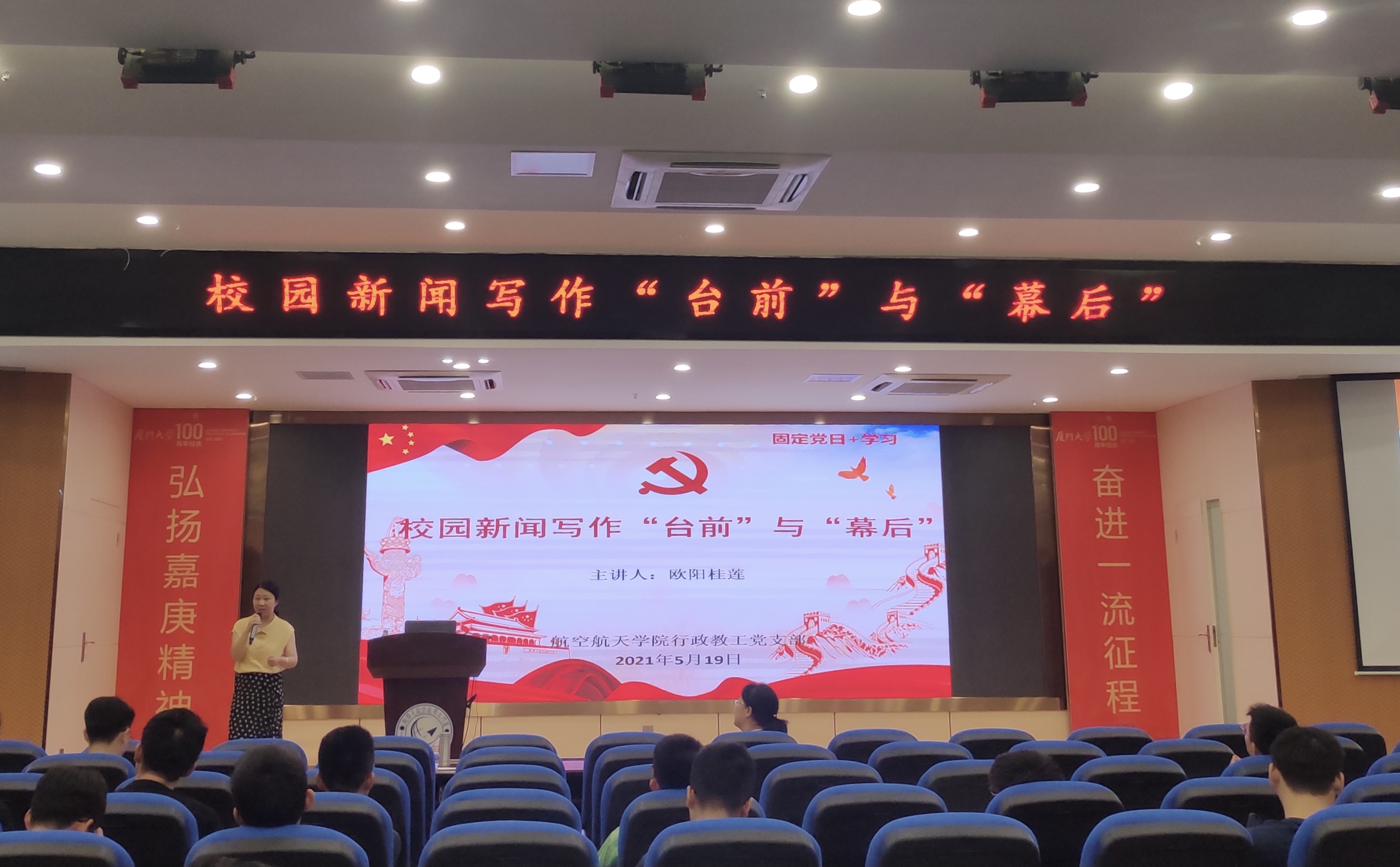 5月19日上午,为培养师生宣传素养、提升师生宣传技能,航空航天学院邀请校党委宣传部欧阳桂莲老师在院楼547报告厅为行政教工党支部、师生宣传负责人代表做了题为《校园新闻写作“台前”与“幕后”》的专题讲座。本次讲座为学院行政支撑中心“逐梦九天”职业能力提升培训第三期暨“启航思政讲坛”第四期活动,院党委副书记林蔚出席活动,欧阳桂莲担任“一站式”兼职辅导员所联系的翔安校区南安园区学生代表也参加了活动。