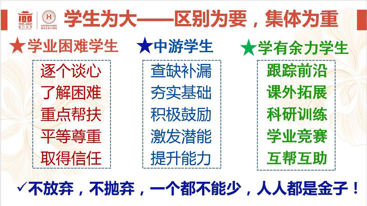 学习上,身为专任教师的班主任,充分利用专业知识为同学们答疑解惑,帮助优秀的同学明确前进方向,帮助学习困难的同学梳理知识点。2017级生物工程班班主任王海涛老师认为每个学生都是金子,都有他们的闪光点。她从成绩到性格,认真梳理每个学生的基本情况,对学生进行分类指导,让班上每个学生本科四年都过得有意义,有成就。
