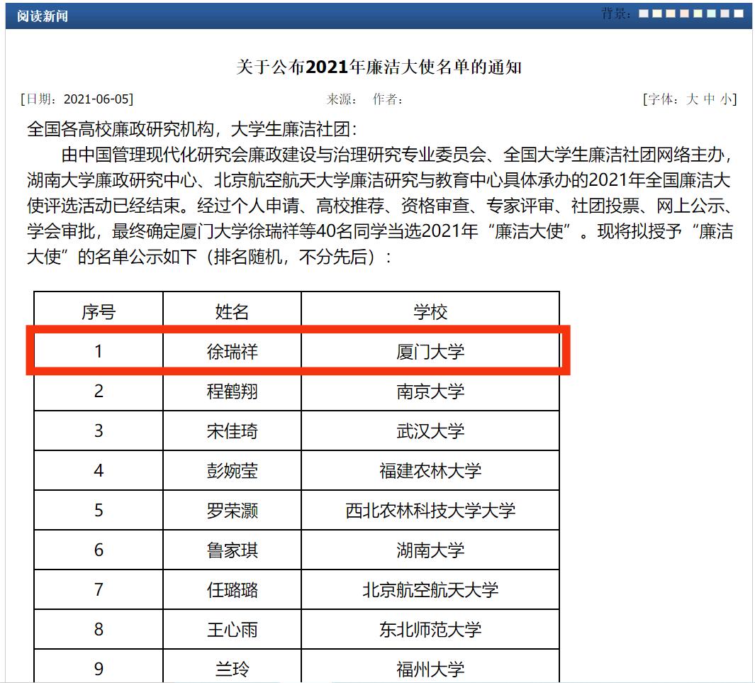 日前,在由中国管理现代化研究会廉政建设与治理研究专业委员会、全国大学生廉洁社团网络主办,湖南大学廉政研究中心、北京航空航天大学廉洁研究与教育中心承办的2021年全国廉洁大使评选活动中,法学院徐瑞祥同学荣获2021年全国“廉洁大使”荣誉称号。