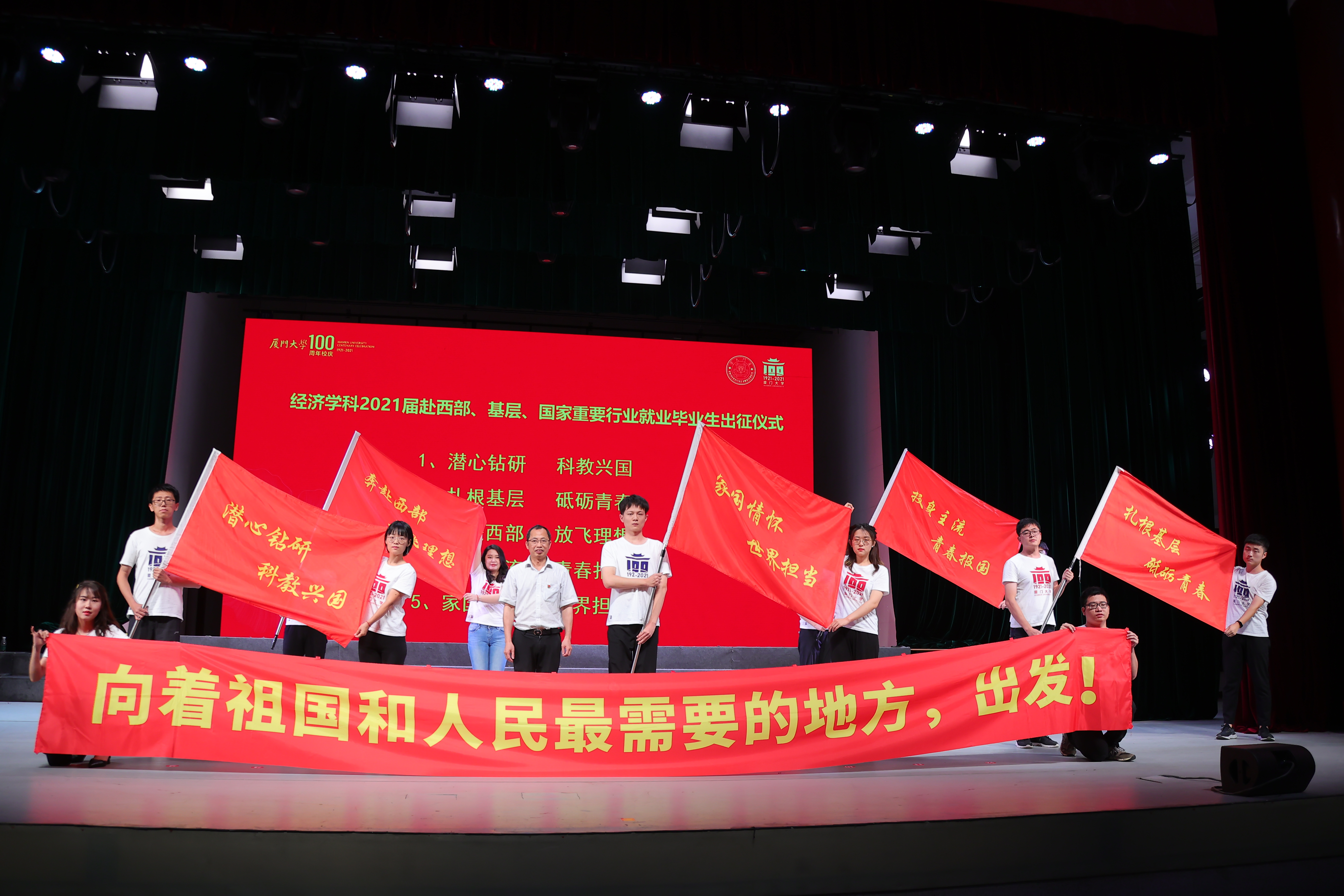 今日学已成,明日展鸿鹄。经济学院党委书记黄鸿德为赴西部、基层、国家重要行业就业毕业生授旗,他们将带着所有师生的祝福在祖国最需要的地方奉献青春和智慧,书写不一样的人生华章。