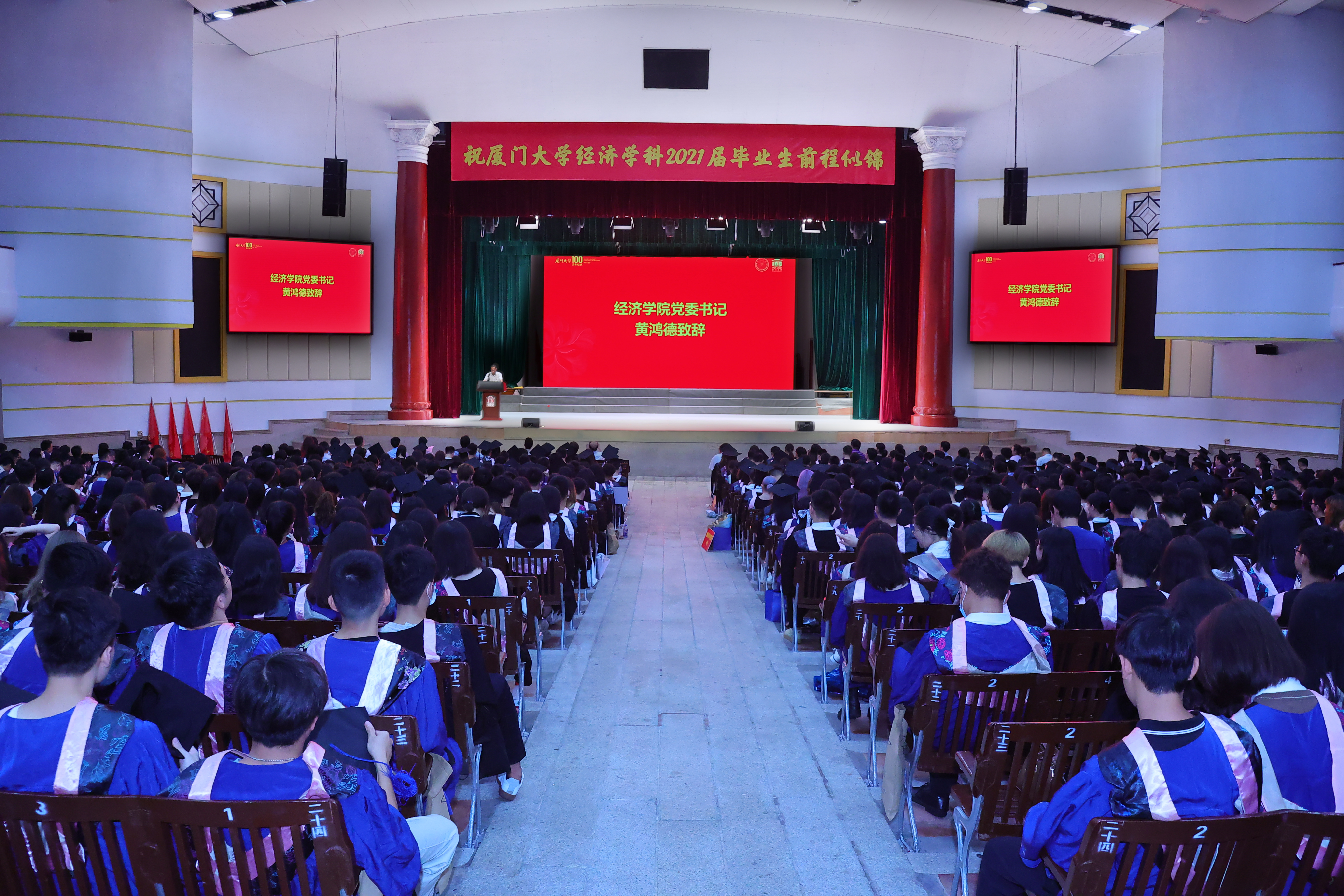 仲夏蝉鸣游子意,凤凰花开毕业季。6月23日,厦门大学经济学科2021届毕业典礼在建南大会堂举行。校长助理、研究生院常务副院长、经济学院教授方颖,经济学院党委书记黄鸿德,党委副书记周蕾、杜海林,经济学院副院长朱孟楠,王亚南经济研究院副院长牛霖琳、周颖刚,两院教师代表、行政后勤物业人员代表、全体辅导员及毕业生参加典礼,典礼由杜海林主持。
