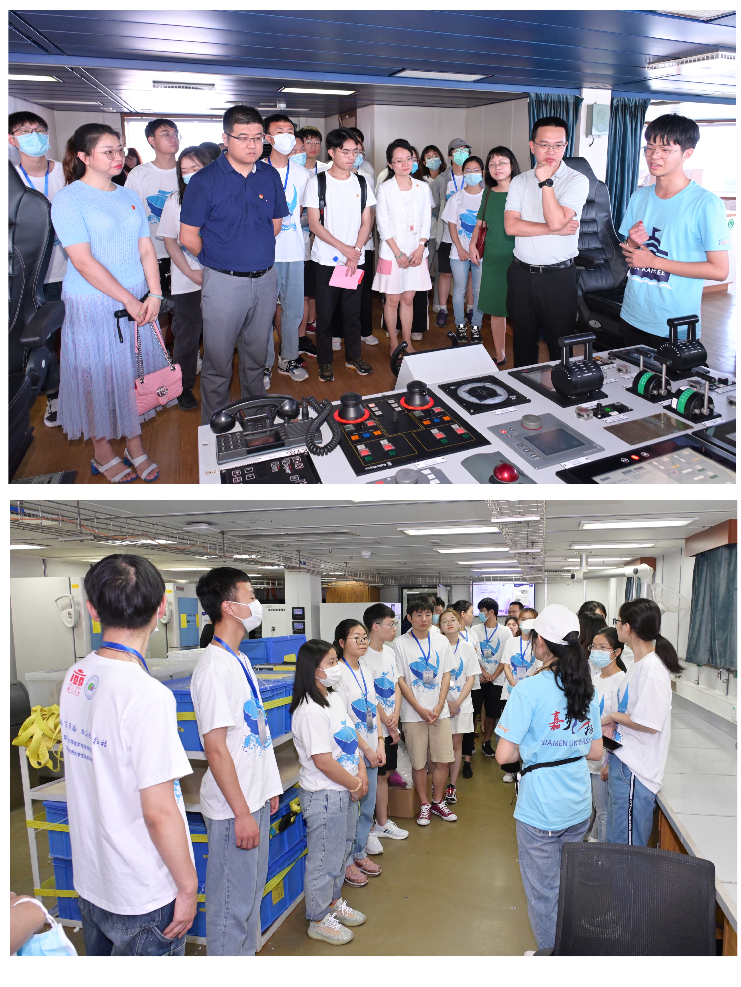成立仪式结束后,“嘉梦海扬”志愿服务团开始了“嘉庚”号上的首场讲解活动。在两位志愿服务团成员冯燕娇和张思鹏的引导下,与会嘉宾和夏令营营员们参观了“嘉庚”号科考船的主实验室、电子实验室、资料处理室、驾驶室、会议室和餐厅。志愿服务团的成员们分布在各参观点,为与会嘉宾和夏令营营员们详细介绍船体构造和功能,解密船上各类尖端设备,科普海洋知识。志愿者们专业而生动的讲解,将很多海洋知识形象地展现在参观者眼前,让参观者近距离目睹“海上厦大”的别样风采,体验海洋科学的独特魅力。