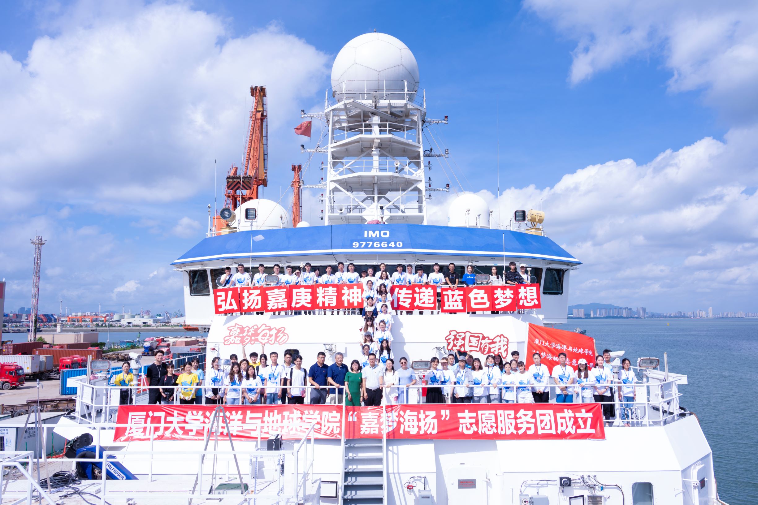 仪式上,厦门团市委组织部张云鹏部长为“嘉梦海扬”志愿服务团授旗, 张思鹏代表“嘉梦海扬”志愿服务团接过队旗,并简要介绍团队情况。“嘉梦海扬”志愿服务团是由厦门大学海洋与地球学院精心打造的、以弘扬“嘉庚精神”为宗旨、以传递“蓝色梦想”为使命的青年志愿服务团队。该志愿服务团由海洋与地球学院团委和科考船运行管理中心的老师共同指导,旨在传承和发扬发扬嘉庚先生毕生报国的爱国情怀、敢于担当的创新精神和无私奉献的优良品格,并致力于将“嘉庚精神”融入到普及海洋知识、传播海洋文化、提高海洋意识的行动中,融入到保护海洋生态、维护海洋权益、建设海洋强国的实践中,引导公众更好地关心海洋、认识海洋、经略海洋。