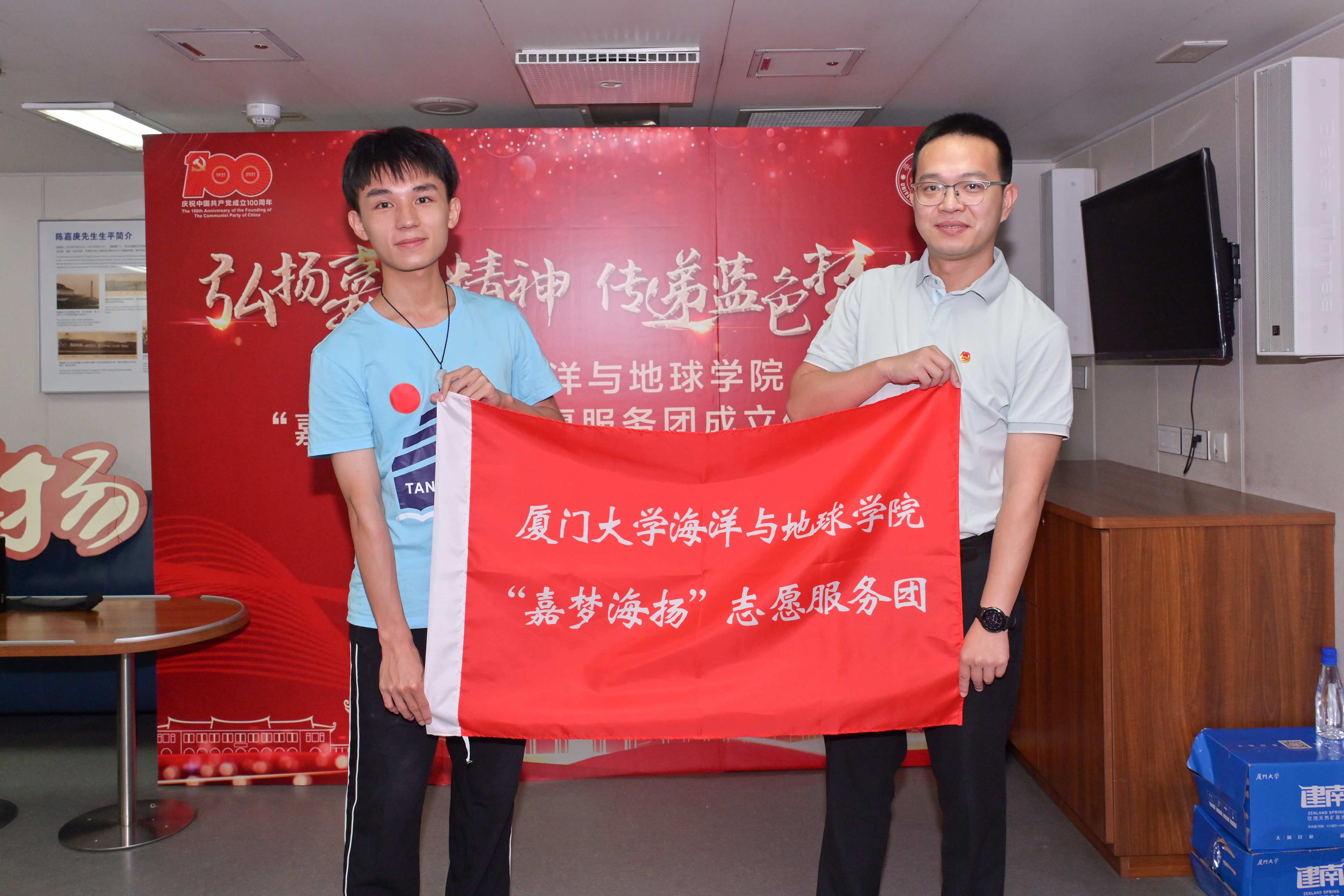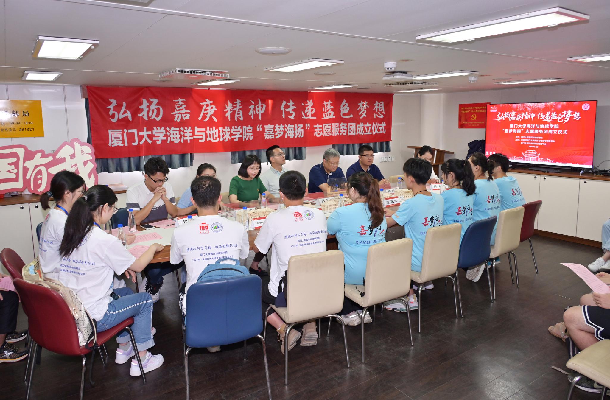 为进一步学习贯彻习近平总书记“七一”重要讲话精神和习近平总书记致厦门大学建校100周年重要贺信精神,7月11日上午9时,厦门大学海洋与地球学院“嘉梦海扬”志愿服务团成立仪式在“嘉庚”号科考船会议室举行。共青团厦门市委常委、组织部部长、一级调研员张云鹏,共青团厦门市委宣传部二级主任科员、志愿者联合会秘书长任肖帆,厦门大学海洋与地球学院副院长、厦门大学科考船运行管理中心主任王海黎,共青团厦门大学委员会组织部部长王心君,海洋与地球学院团委书记陈启妍、辅导员黄良,“嘉梦海扬”志愿服务团成员以及厦门大学2021 年全国大学生海洋科学夏令营营员代表出席了“嘉梦海扬”志愿服务团成立仪式。仪式由海洋与地球学院党委副书记唐腾凤老师主持。