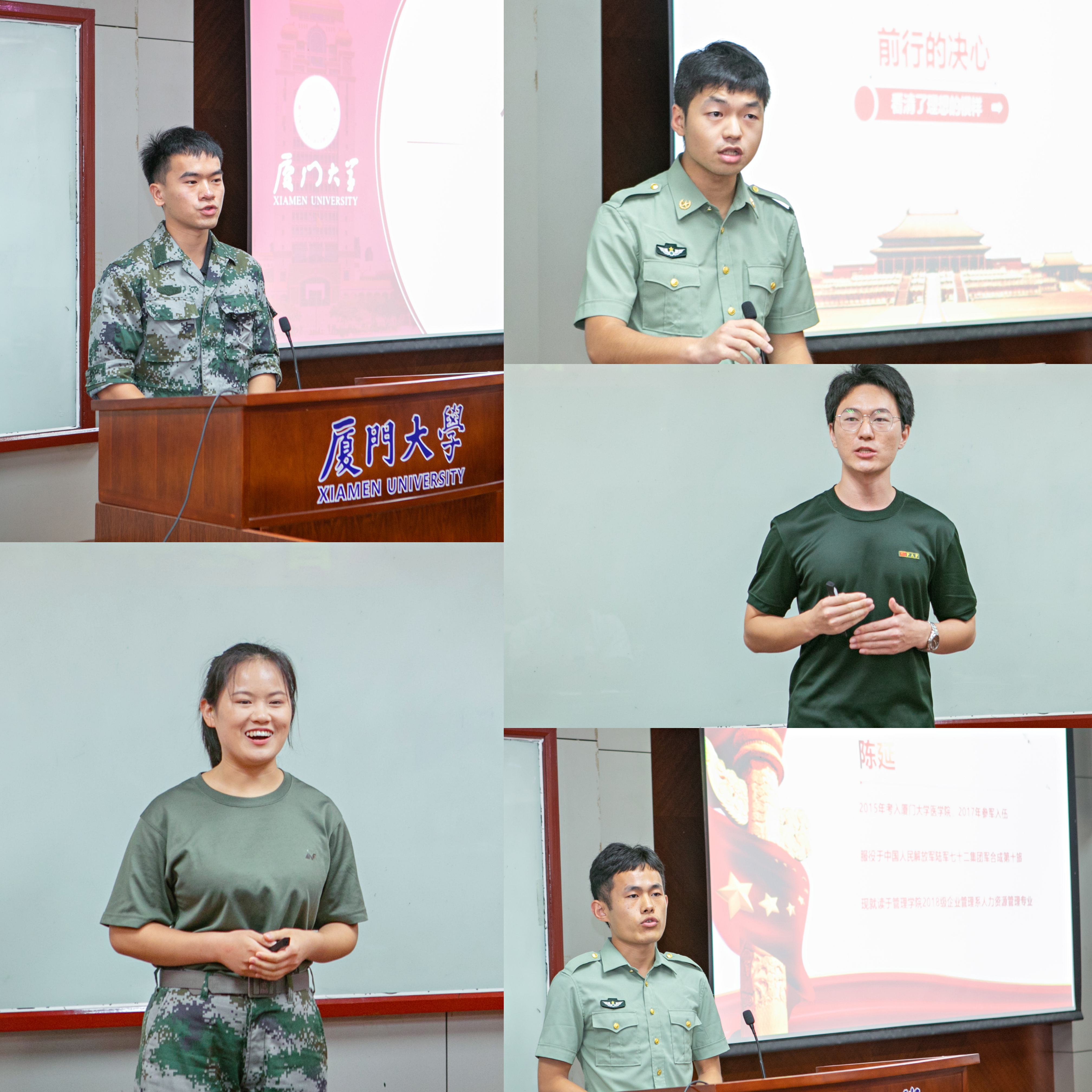7月19日下午,一堂由学生讲授、教师倾听的微党课在管理学院嘉庚二201会议室举行。陈延、洪晓东、杨恺铭、杨公云、彭派等五位身披迷彩的管理学院退伍大学生走上讲台,以习近平强军思想为指引,以汗水与血泪绘就的军旅青春为主线,采用PPT与视频素材相结合的方式,面对全院党员教职工开讲“强国梦、强军梦”主题微党课。