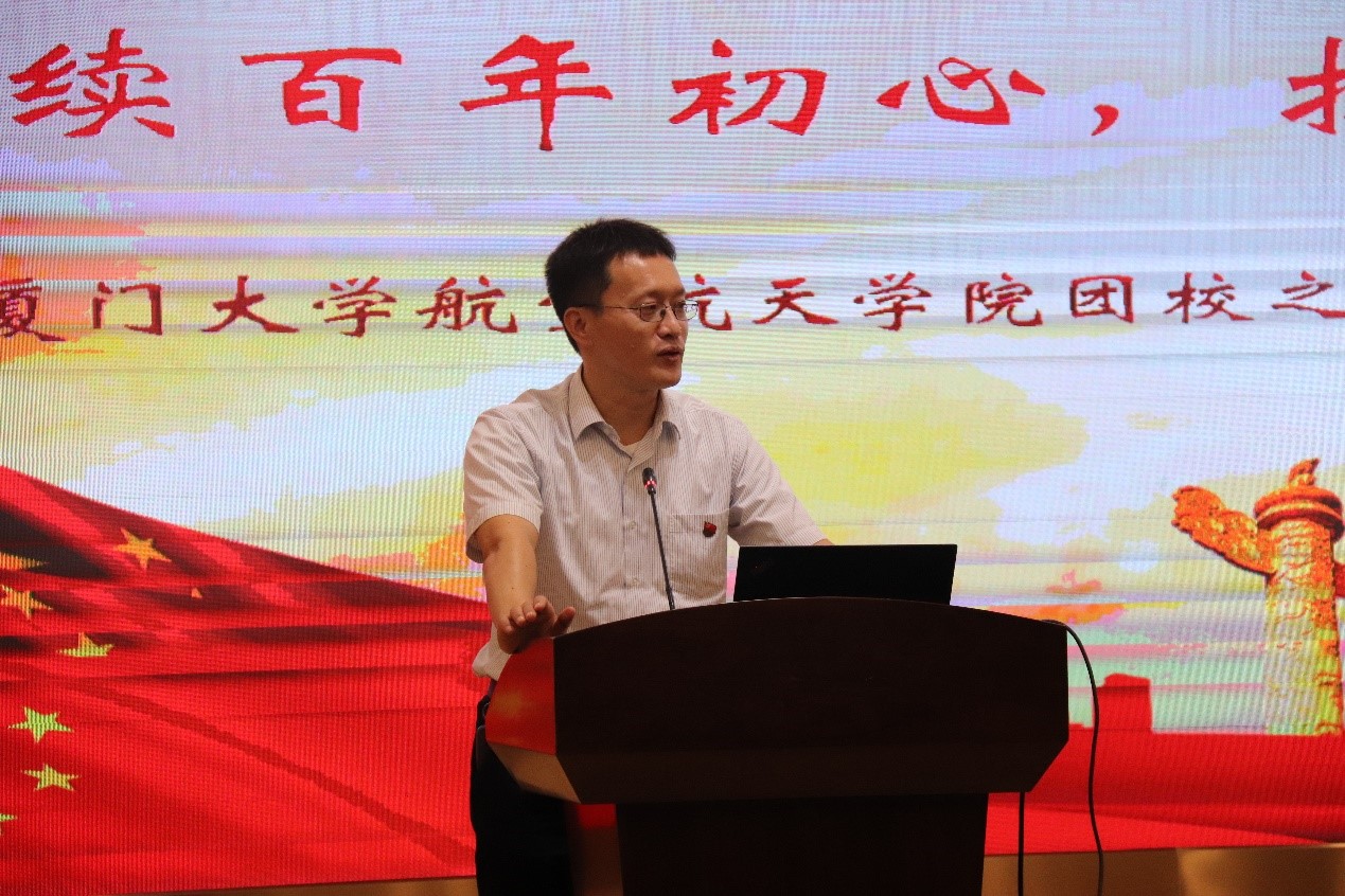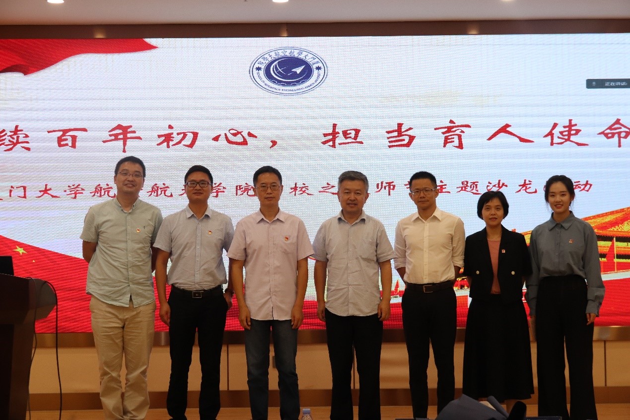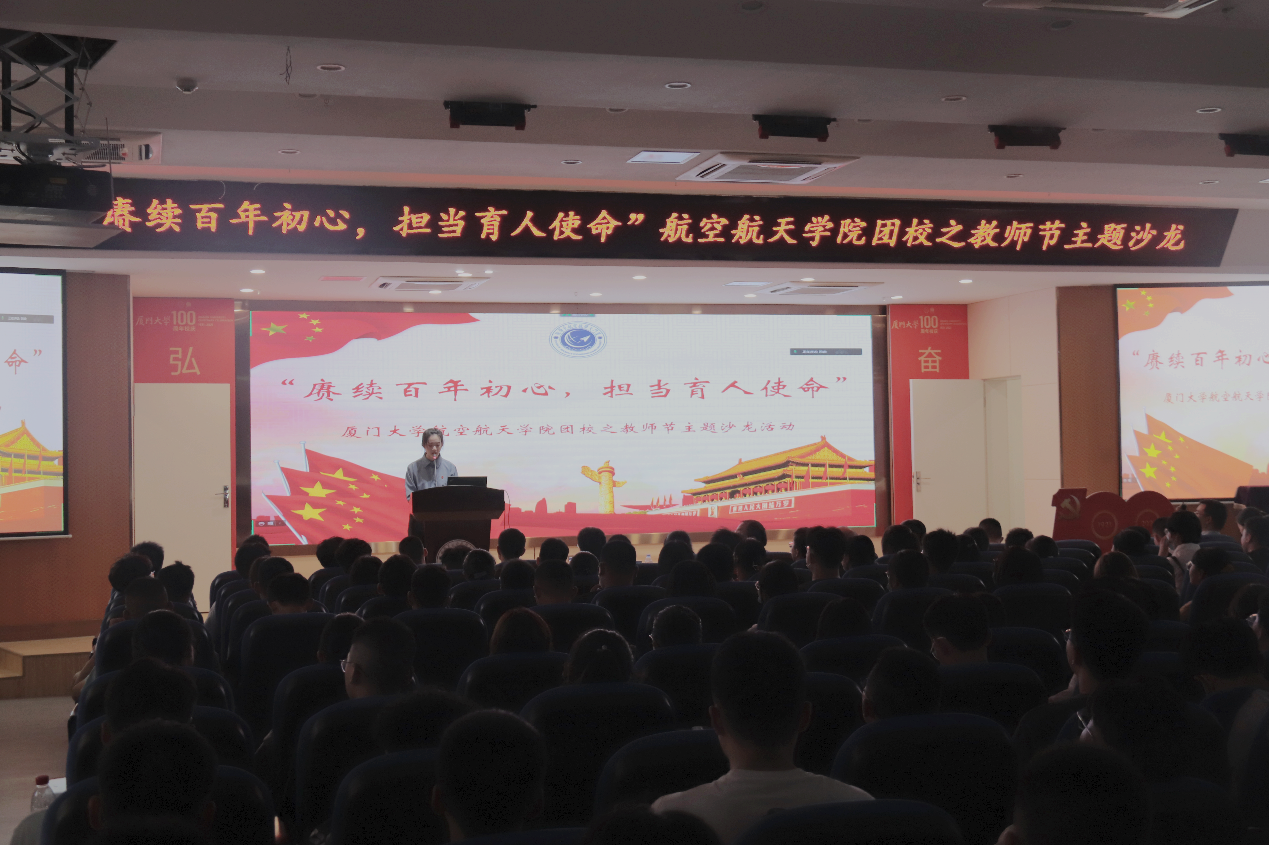 厦门大学航空航天学院结合新生入学教育特别举办2021年团校之“赓续百年初心,担当育人使命”教师节主题沙龙。院党委书记王康平,院党委副书记张晴、林蔚,飞行器系李沁教授、自动化系刘暾东教授、动力工程系冮铁强副教授、机电工程系王磊副教授、仪器与电气系柳娟副教授,以及学院全体辅导员、2021级全体本科新生参加活动。